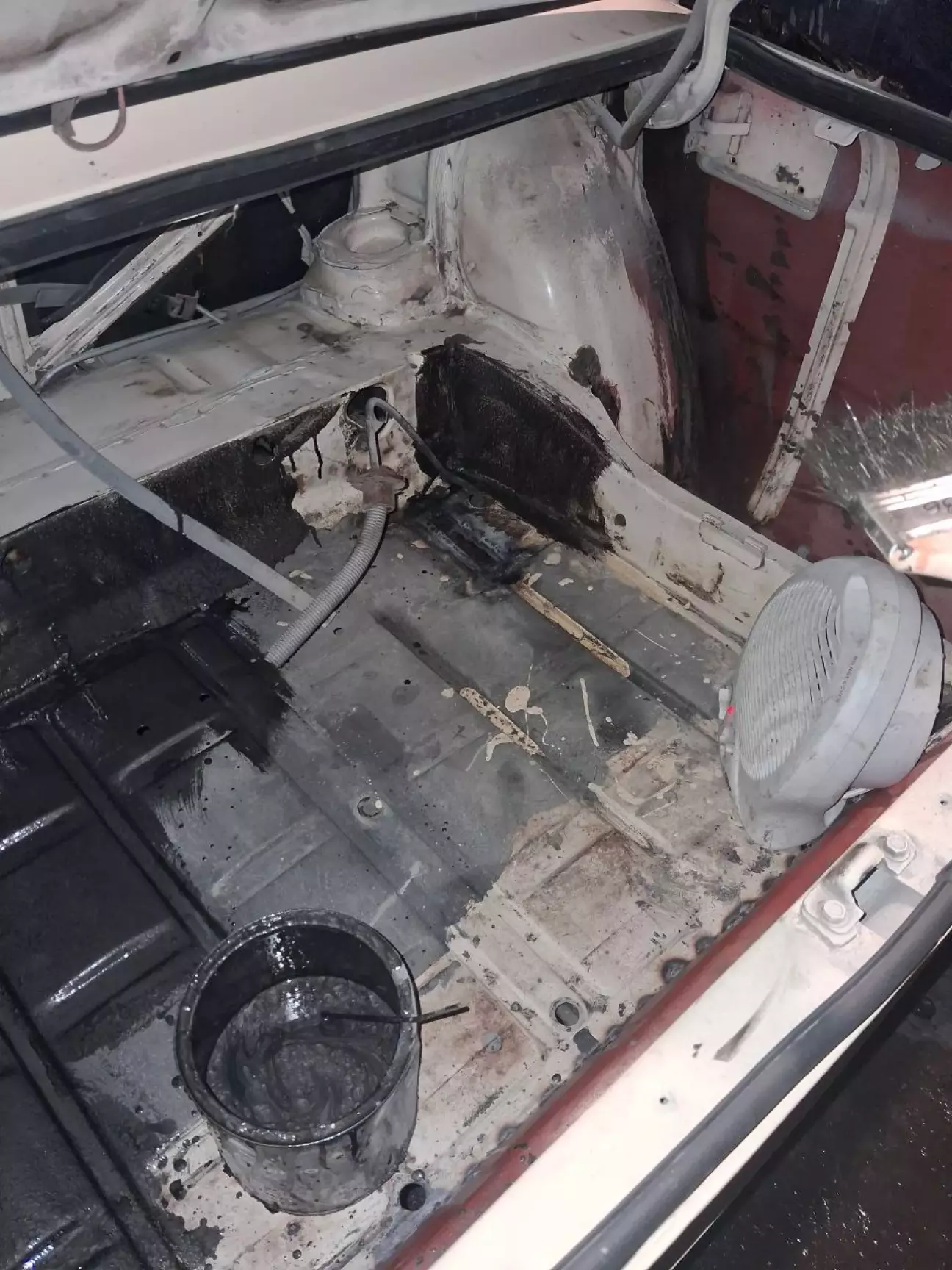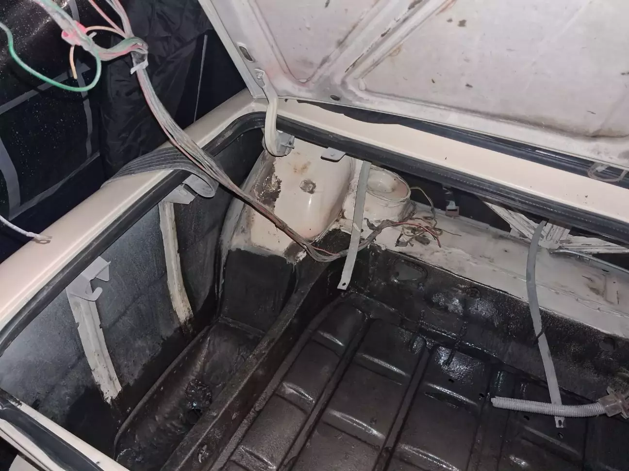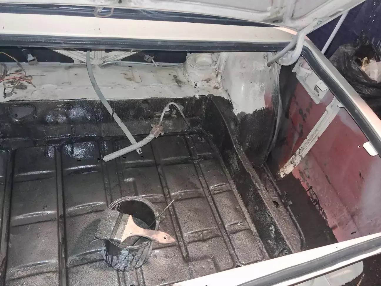 Після фарбування згадав про задній фартух, про який писав в третій частині. Після заміни заднього фартуха і підсилювача прочав фарбувати багажник. Взяв антикорозійну молоткову фарбу і вперед. разом купив садовий намет 3х6х2.5 щоб було зручніше.