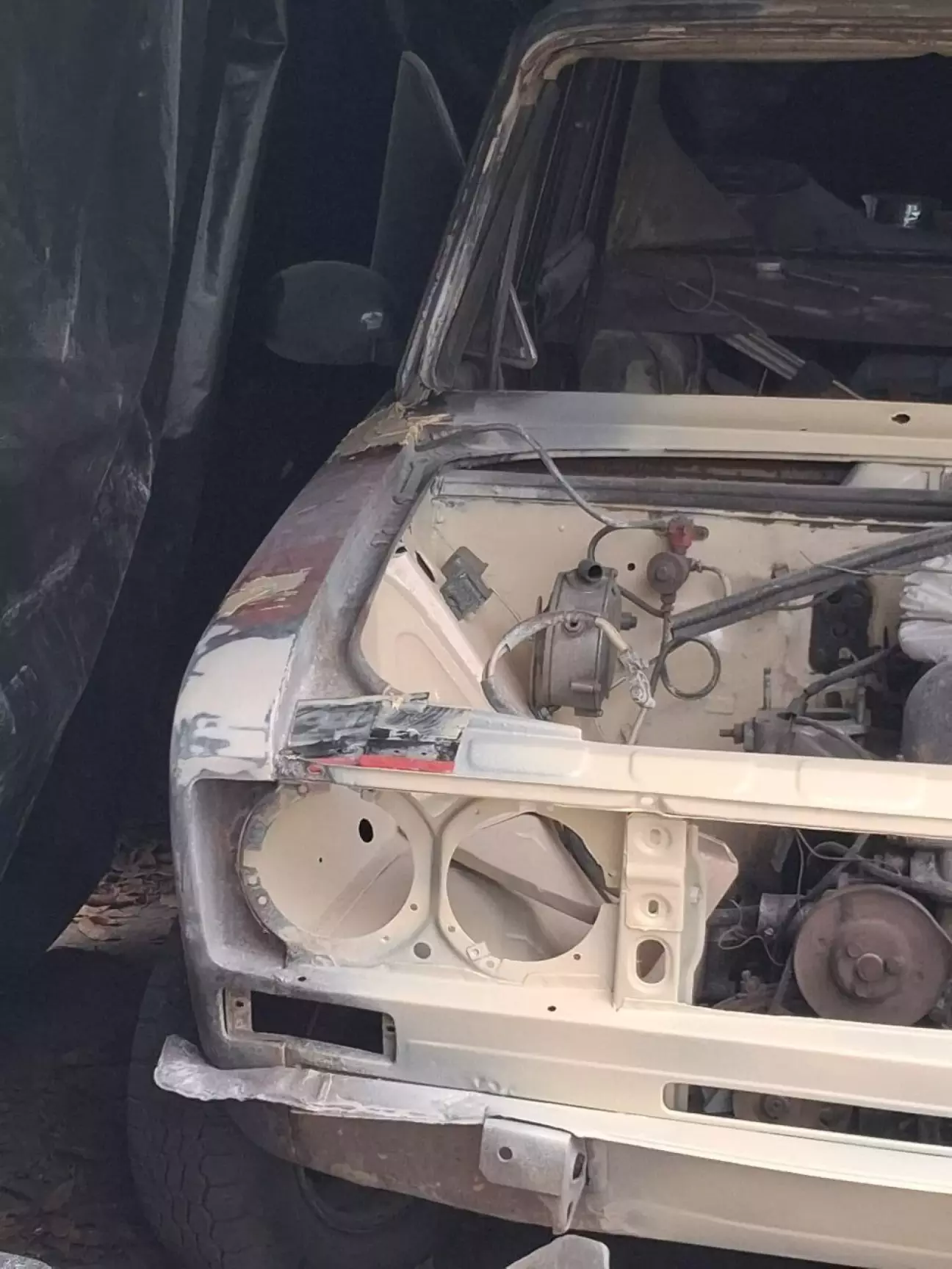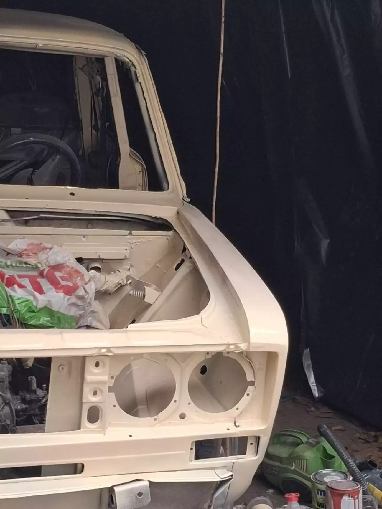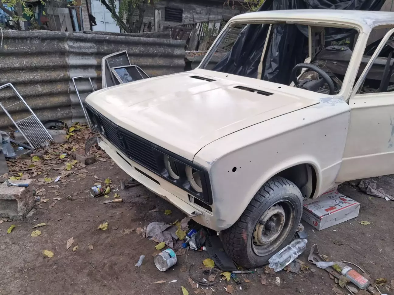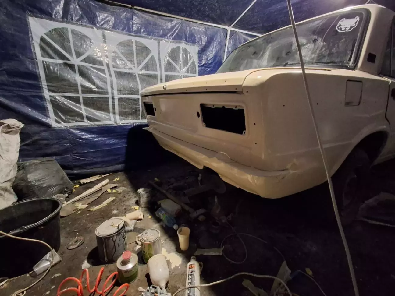 Хоча деякі етапи малярки робилися разом із поваркою кузова, тому що ситуація в прифронтових містах, де робилося авто, була різна. Роботу почав з задніх крил. Для малярки було куплено 2 банки 2х компонентного кислотного грунту з затверджувачем 1:1, 3 банки двохкомпонентного акрилового сірого грунту 1:4. Оскільки авто по документах бежеве і я з братом вирішили не відходити від техпаспорта. для цих цілей придбав 3 банки 2х компонентної бежевої автоемалі 1:2 "Лада 228 бежева "Чайна троянда"". Брат затвердив вибір, так як був ще варіант купити фарбу "Лада 277"антилопа"". Але він її не захотів.