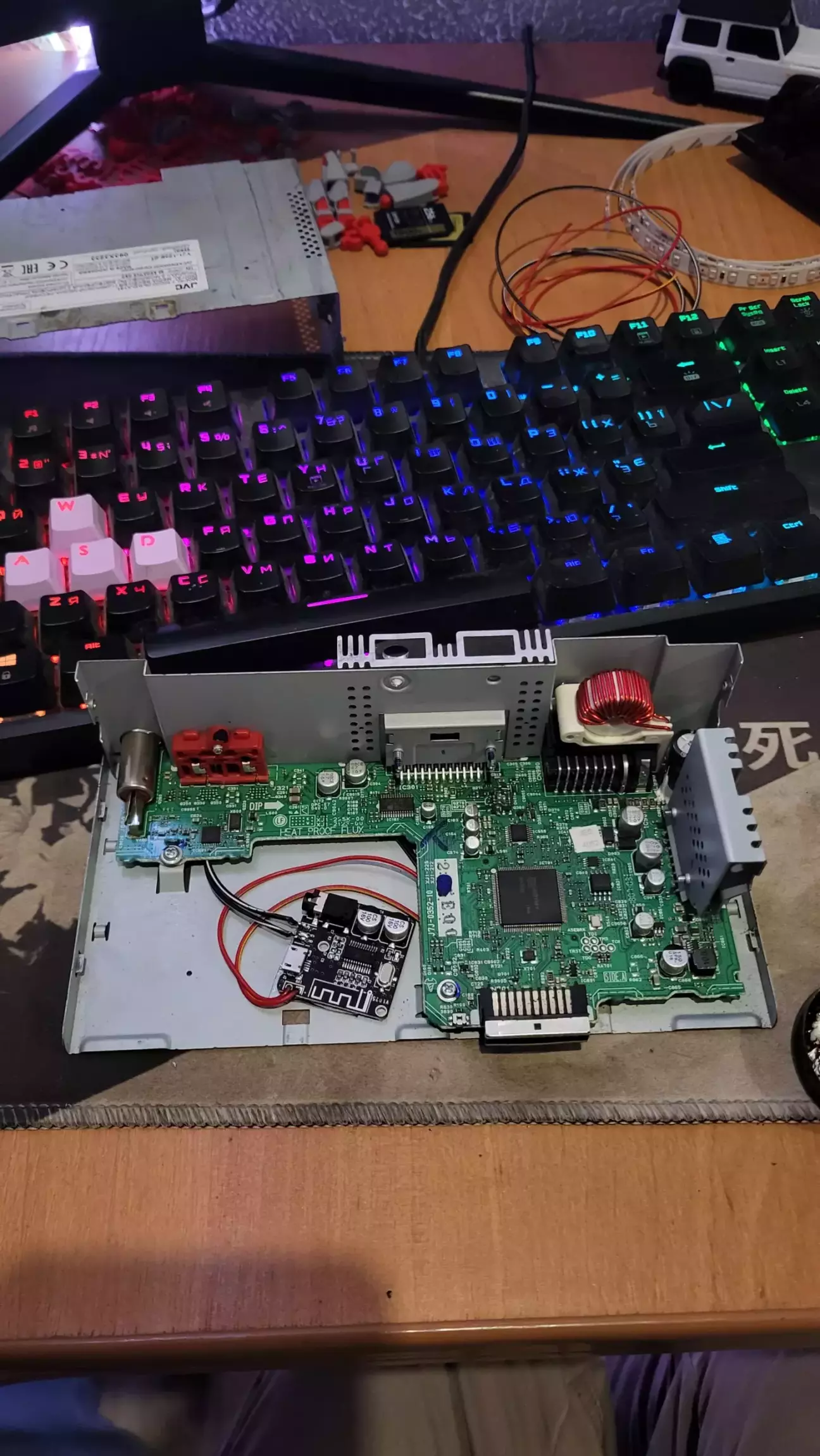 Вирішив зробити допрацювання своєї магнітоли JVC KD X151. Стояла вона тут ще з моменту придбання, хоч й досить дешева, але грає непогано. Основний нюанс - відсутність Bluetooth. Ще на минулу автівку придбав модулятор, що втикається в aux, але вічне "дьоргання" щоб увімкнути його, розшатало роз'єм. Тому вирішив припаяти платку в саму магнітолу. На щастя, не довелось прозванювати мультиметром доріжки (при собі на той момент його не було). Вдалось знайти схему. Тож годинка роботи і все стоїть як треба. Якість звуку в рази краща в порівнянні з зовнішнім модулятором, та й зручніша в користуванні. При увімкненні режиму AUX, плата вмикається та автоматично під'єднується до телефону.