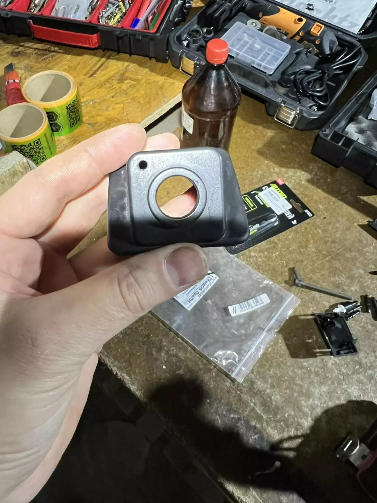 4) У копрусі тримача камери сверлимо отвір 3,5 мм, монтуємо форсунку, для того, щоб камера стала на свої місце доведеться трохи підпиляти її корпус та вирізати місце у проміжному кріпленні під пластикову трубку форсунки.
