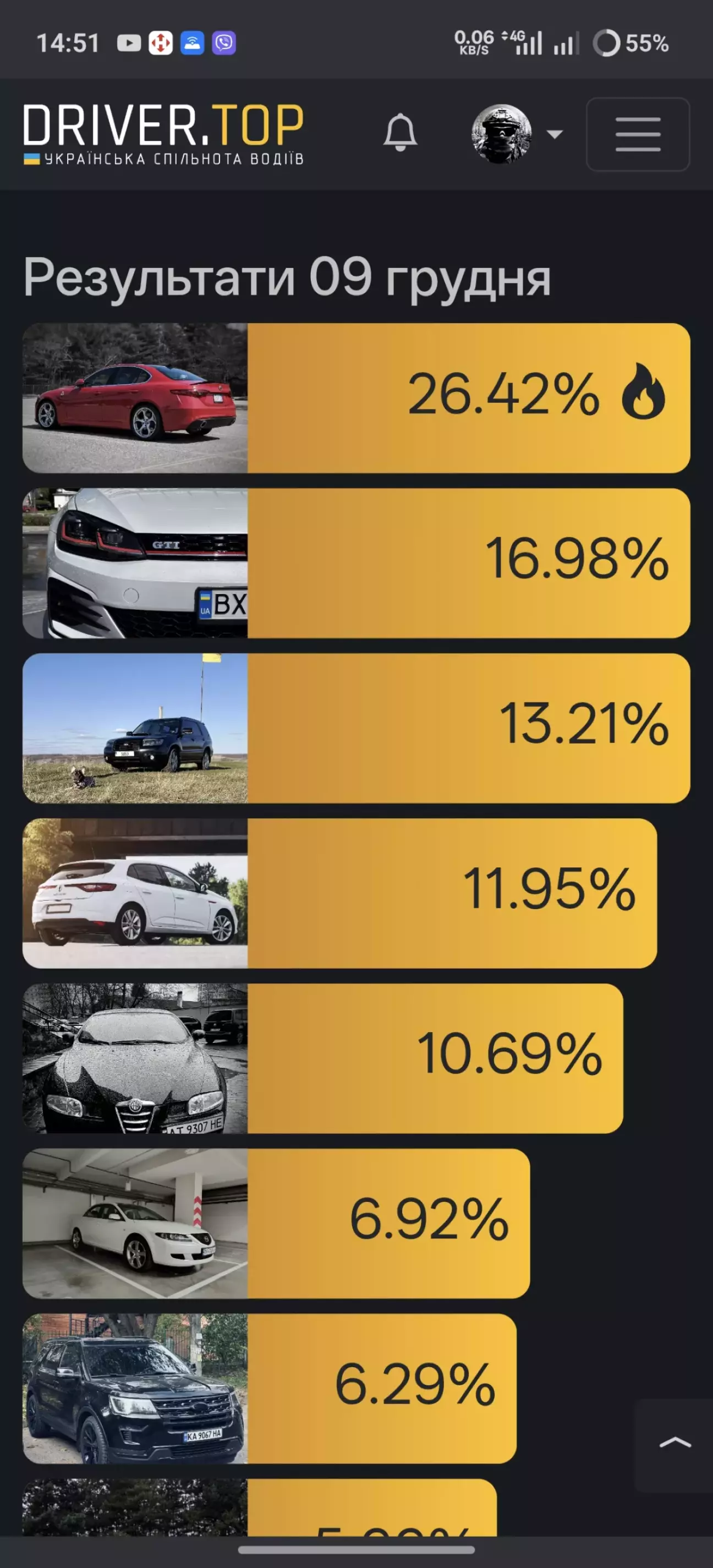 Хочу щиро подякувати всім, хто голосував за моє авто у конкурсі "Авто Дня" на Driver.top! Завдяки вашій активності ми впевнено посіли 3-тє місце! Це вже не вперше ми в топі (були 3-ті та 5-ті).