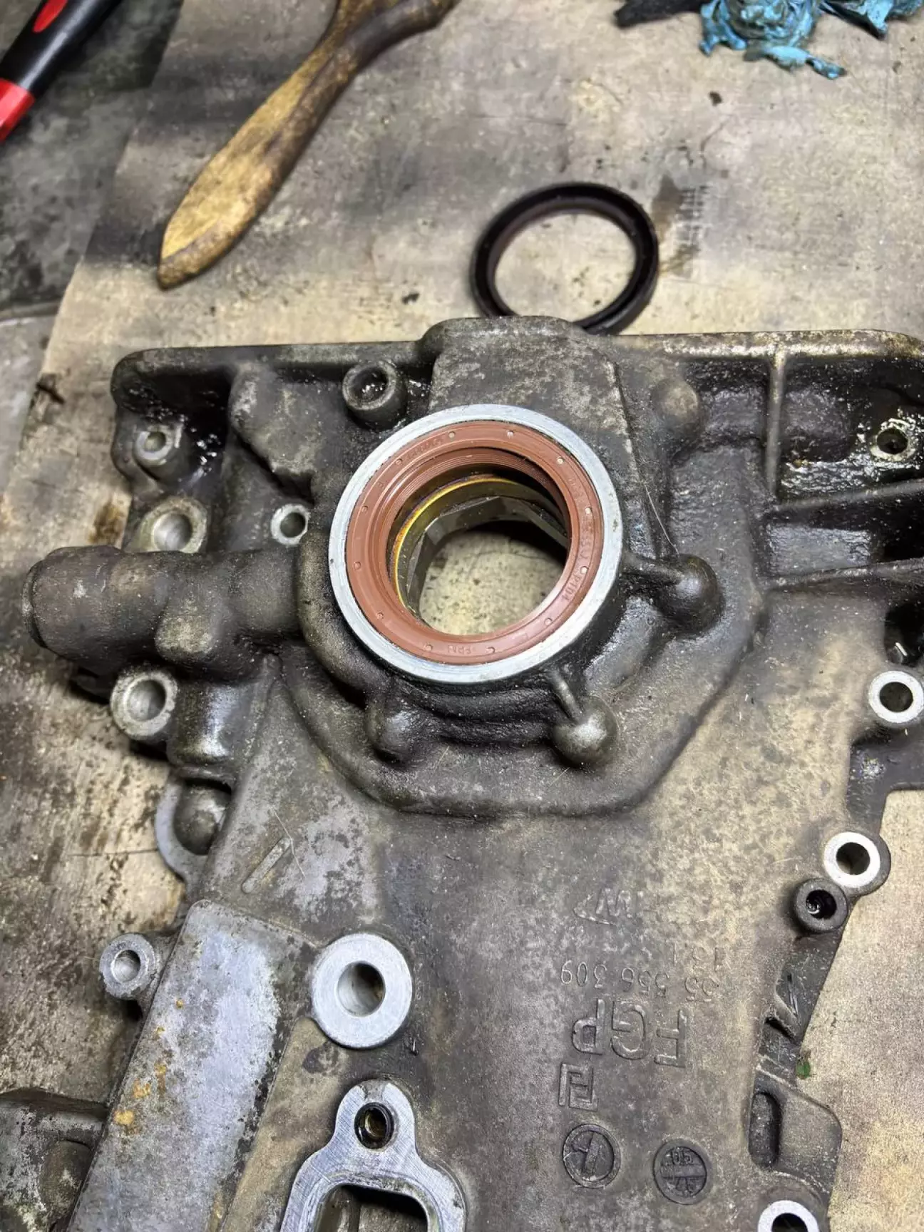Откручиваем помпу - болты разной длинны, главное не перепутать где какой, так же важно не потерять направляющие помпы, откручиваем боковую крышку. Снимаем боковую крышку....И вновь неудача - боковая крышка была заботливо посажена на герметик, внизу есть отливы, за которые удалось отделить крышку при помощи монтировки.
