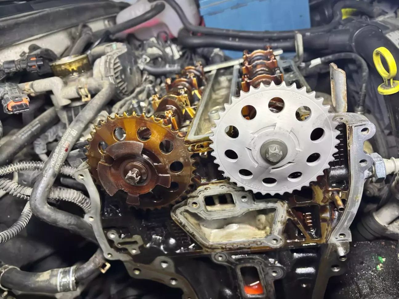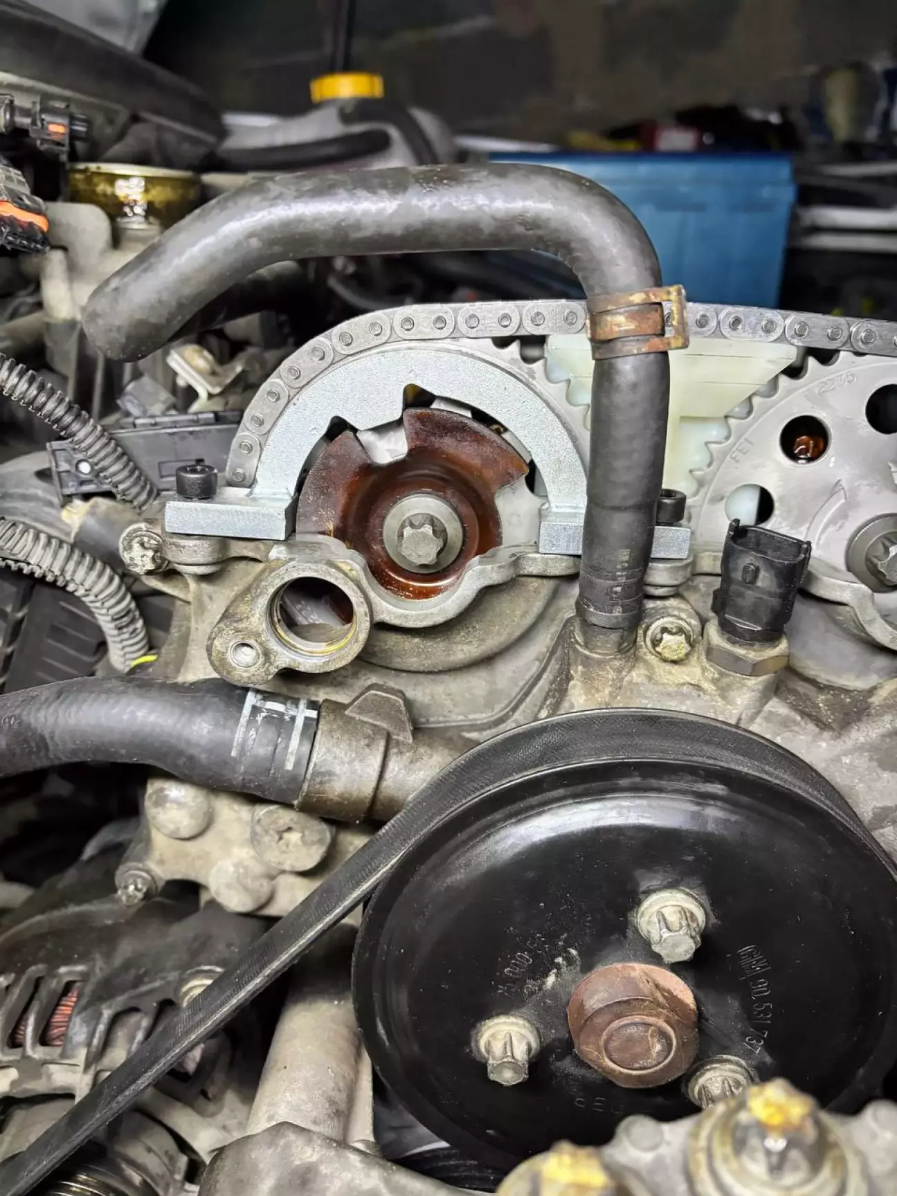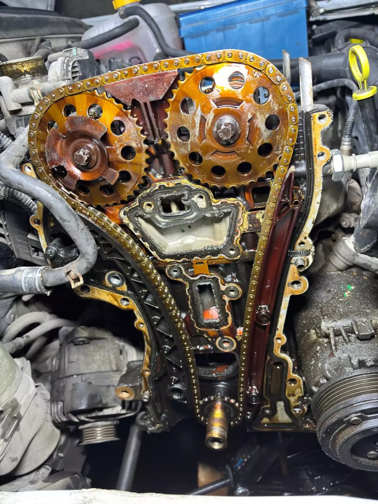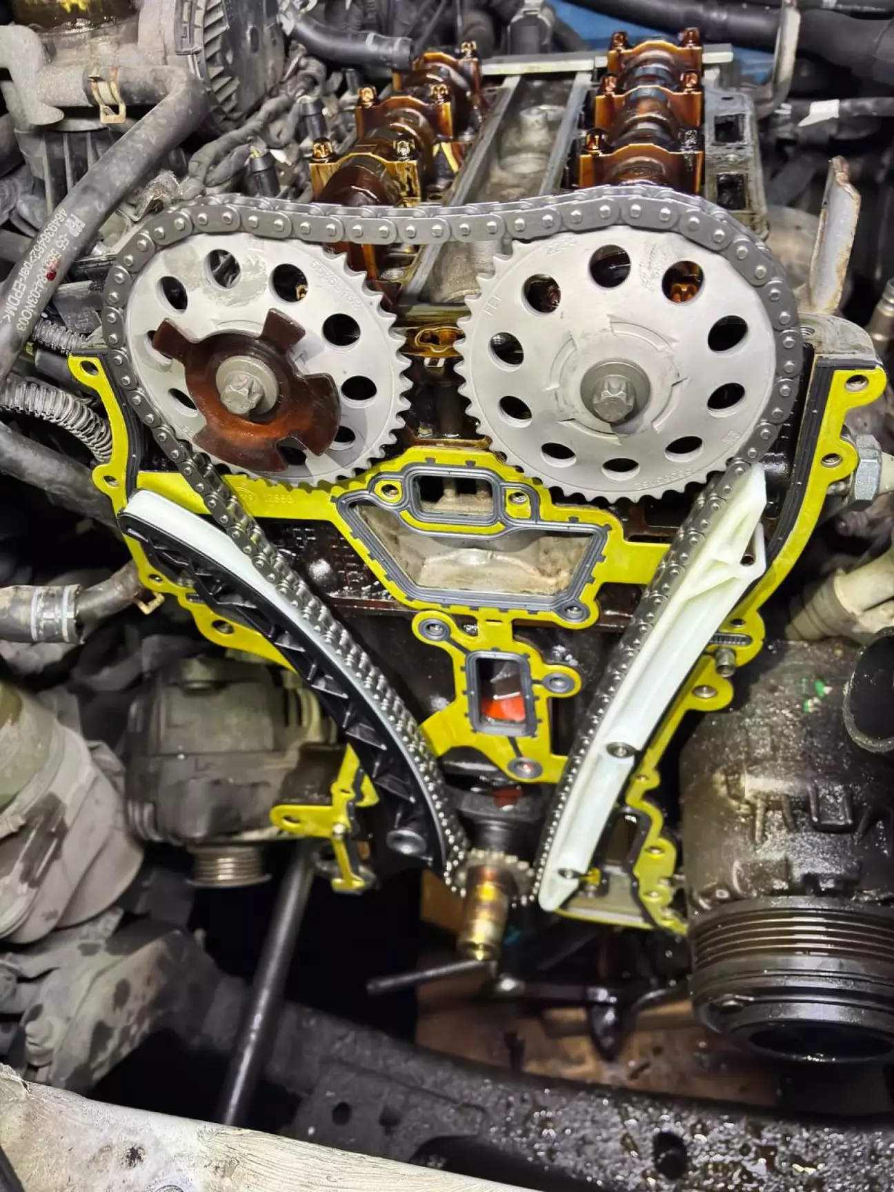 Натяжитель цепи вышел очень сильно, всё в лаке, поддон грязный. Откручиваем пробку фиксатора коленвала, выставляем ГРМ и вставляем фиксаторы, откручиваем зведы головкой Е14, придерживая распредвалы ключом на 22, откручиваем успокоители, натяжитель и снимаем цепь.