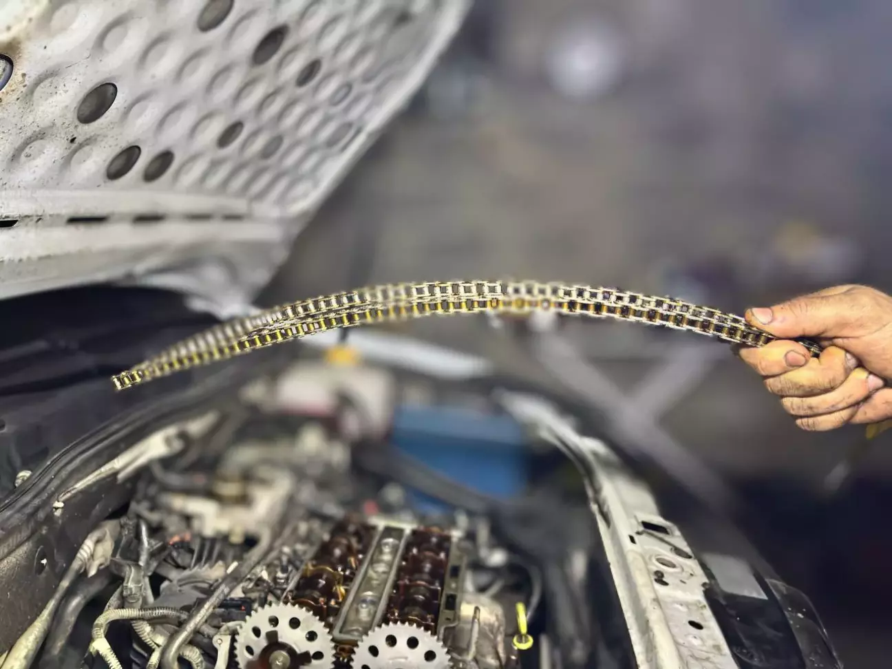 Накидываем цепь на звезду коленвала, далее надеваем на звезду выпускного распредвала, потом впускного. Устанавливаем планку натяжителя - болт затягиваем с усилием 20Нм, направляющую планку - болты затягиваем с усилием 8 Нм, ставим верхний успокоитель - болты затягиваем с усилием 8 Нм. Устанавливаем натяжитель, затягиваем болты 8 Нм и вынимаем фиксатор натяжителя - цепь натянется за счёт незатянутых звёзд.