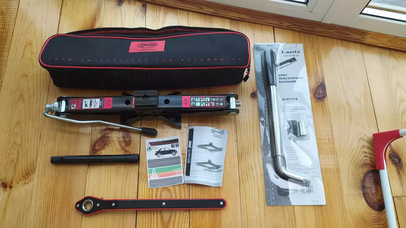 Тому для цієї процедури заздалегідь був придбаний новий домкрат - вартість близько 1610 грн. Вирішив не економити і придбати одразу якісну річ "на все життя". В комплекті сам домкрат, ручка-крутилка, тріскачка, сумка для зберігання, подовжувач, інструкція.