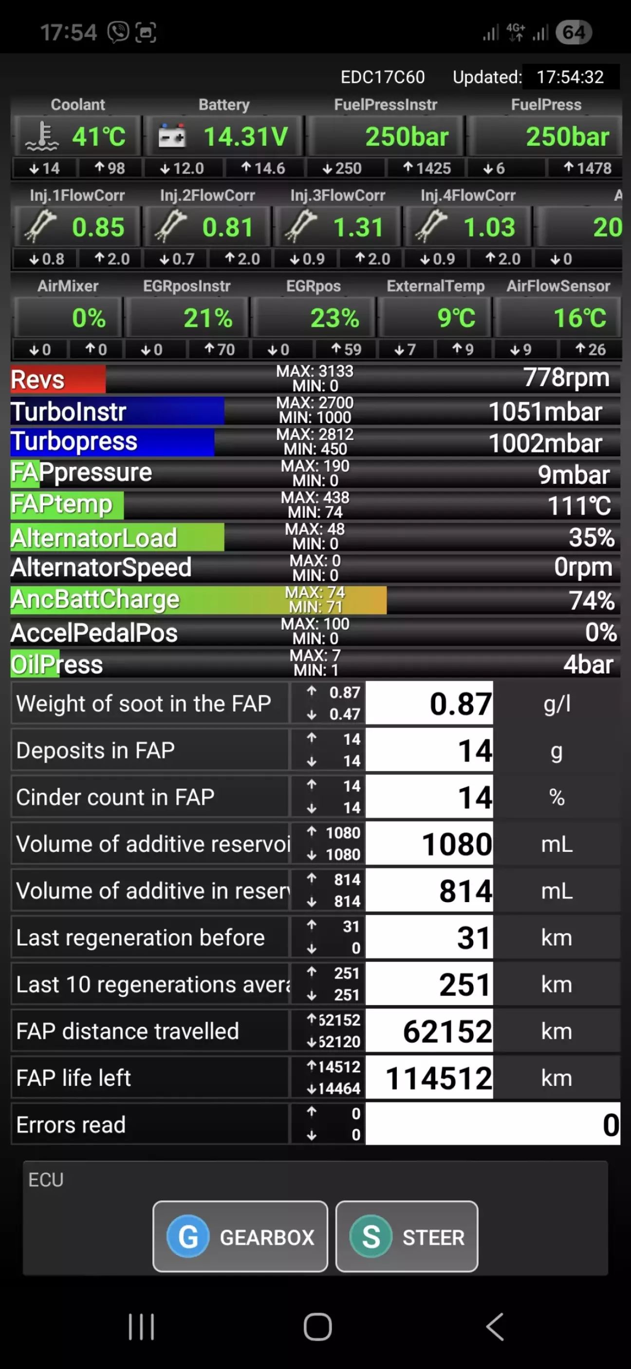 Але до ремонту температура сажового фільтра в мене показувало 500-550 максимум, то тут при їзді на круїзі 2000 об/хв на 5 передачі температура була 615.