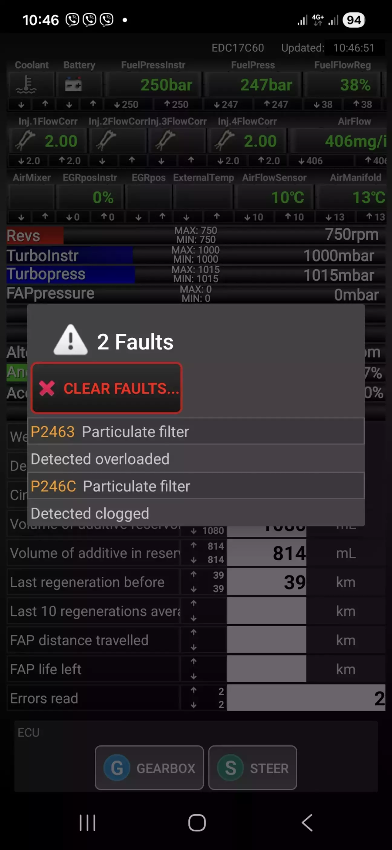 А потім взагалі я почав ловити помилки P2463 і навіть P246C. А при P246C машина падає в аварію і обмежується потужність