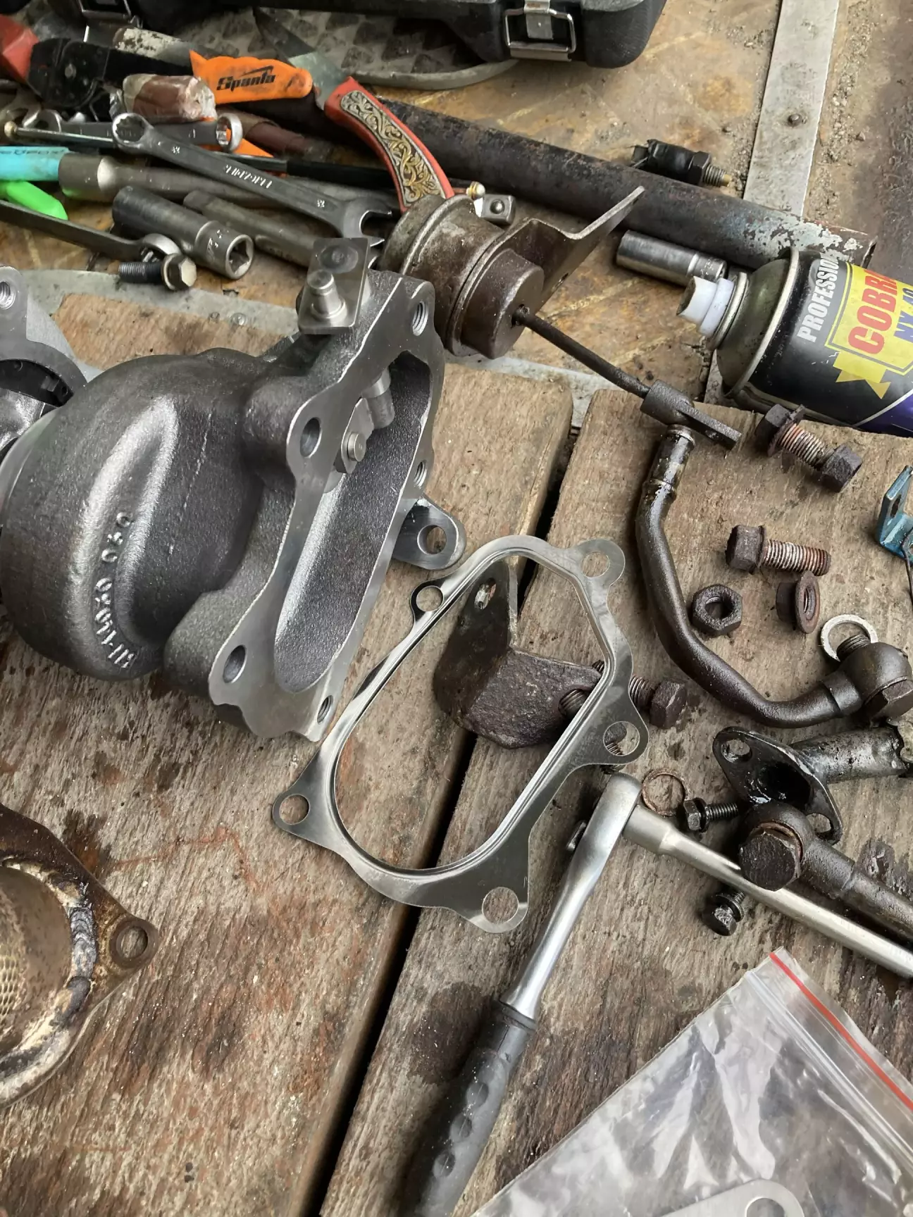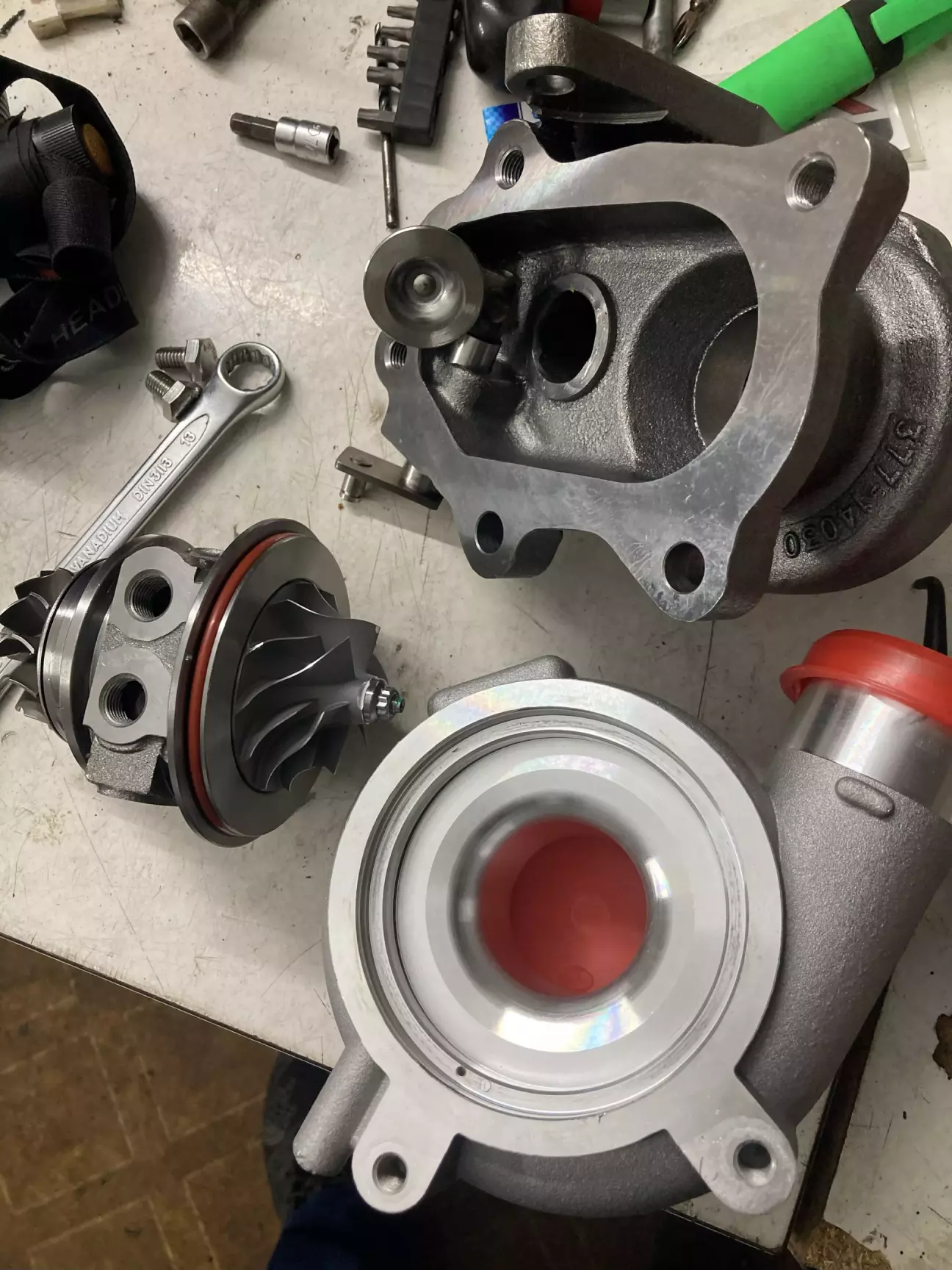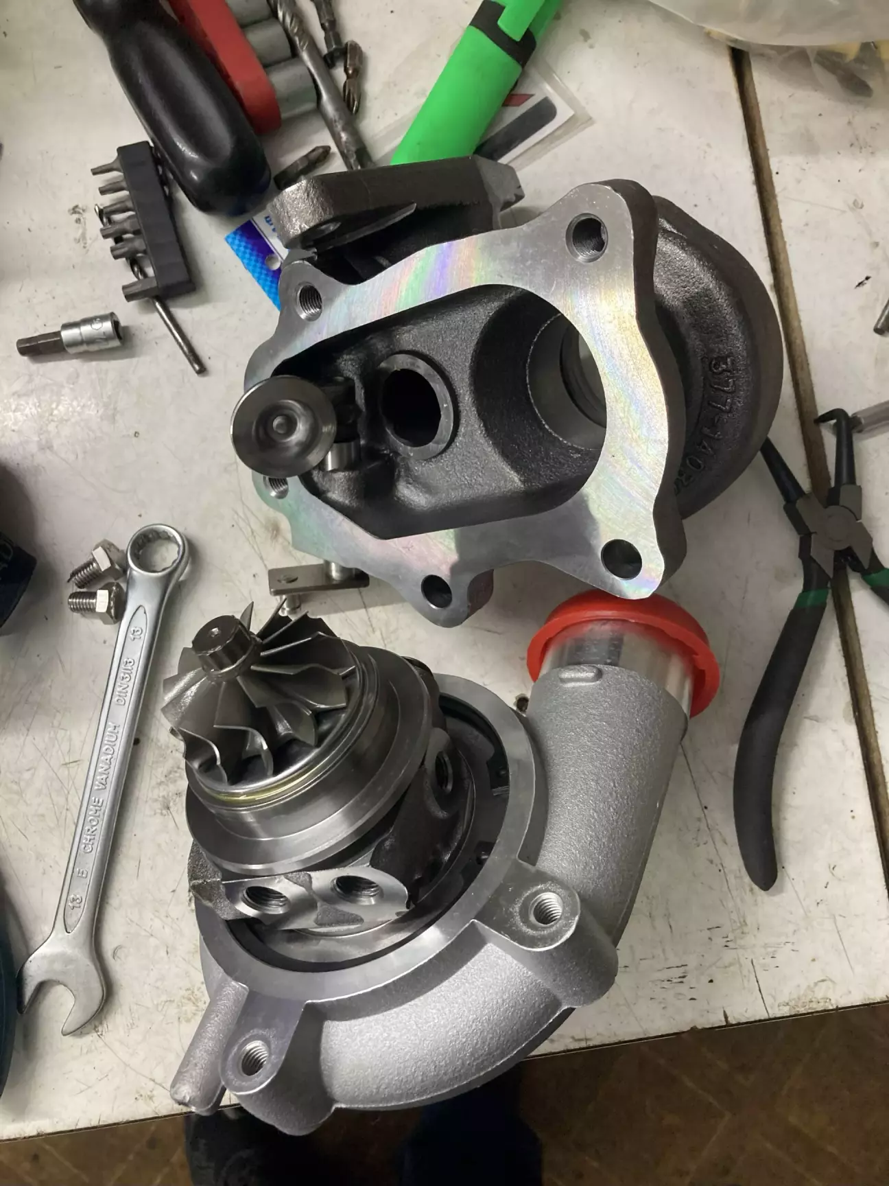 Раз все працює норм, то захотілось поміняти турбіну на нову, бо стара вже має люфт і підбирає масло. Пів дня у гаражі і справу зроблено. Правда на новій актуатор спрацьовує на 0.65 бара, певно поставлю буст-контролер(є у наявності), щоб зменшити до 0.5. Машина їде відчутно яскравіше, підхват відчувається вже з 2 тис. обертів, довелось переналаштовувати суміш.