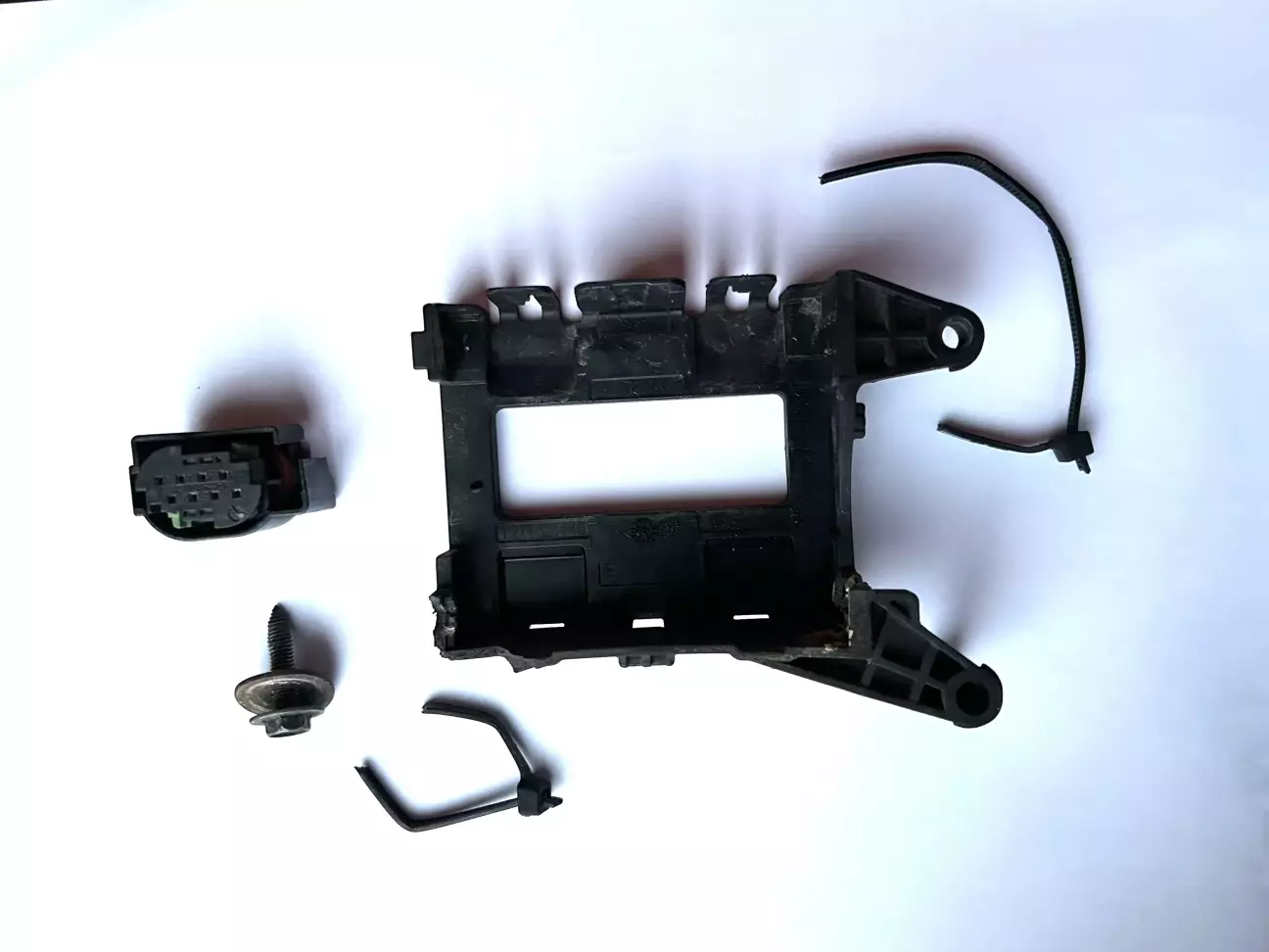 І от 3,5 тижні тому їду я по рівній дорозі і він знову відригує. Всі минулі рази також він відригував на рівній пустій дорозі. Я катаюсь тиждень, два, вже третій закінчується і я розумію що щось не так. Пішов я до чату GPT. І він такий, а ти машину мив? Я-мив. Ну от, попадає волога в роз'єм, він відригує, потім підсихає і все ок. Ок та ок, тільки я машину мив більше тижня назад, і було сухо. Думаю, я нука зніму я кришку радара, гляну шо там взагалі, може фішка відпала, чи кріплення радара зламалося. Знімаю і ах...ю другий раз. Він тримається на болтику і двух стяжках. (шкода я не сфоткав, зате є фотка окремо всього цього чудо крепежа)