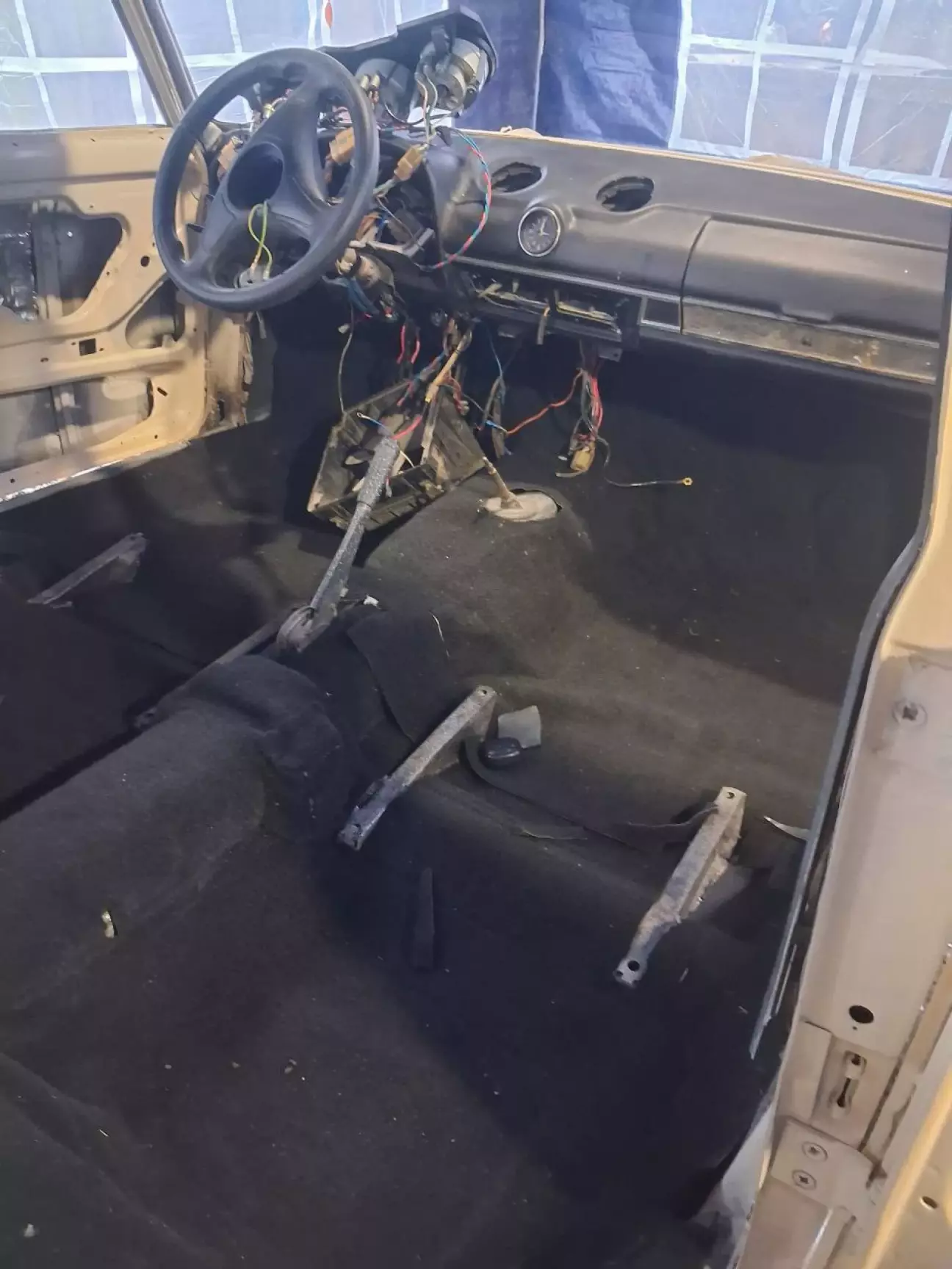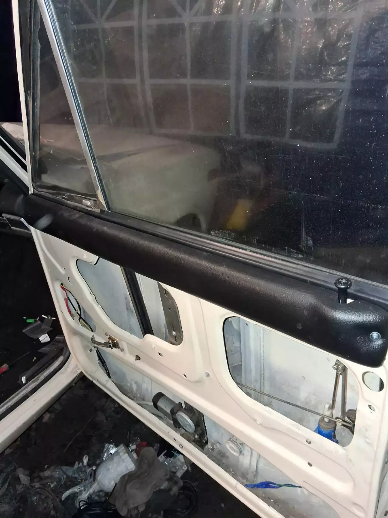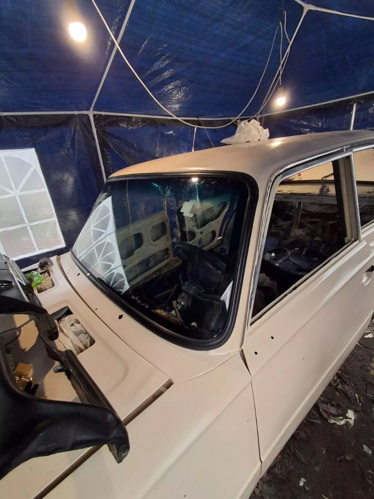 Авто поварене, знизу все оброблене, пофарбоване і я почав процес збору авто. Cпочатку вставив лобове остіклення на нові резинки. Переднє замінив, бо воно було з трішинами. Брав від FIAT-125 нове. Стало мені в 1200грн.