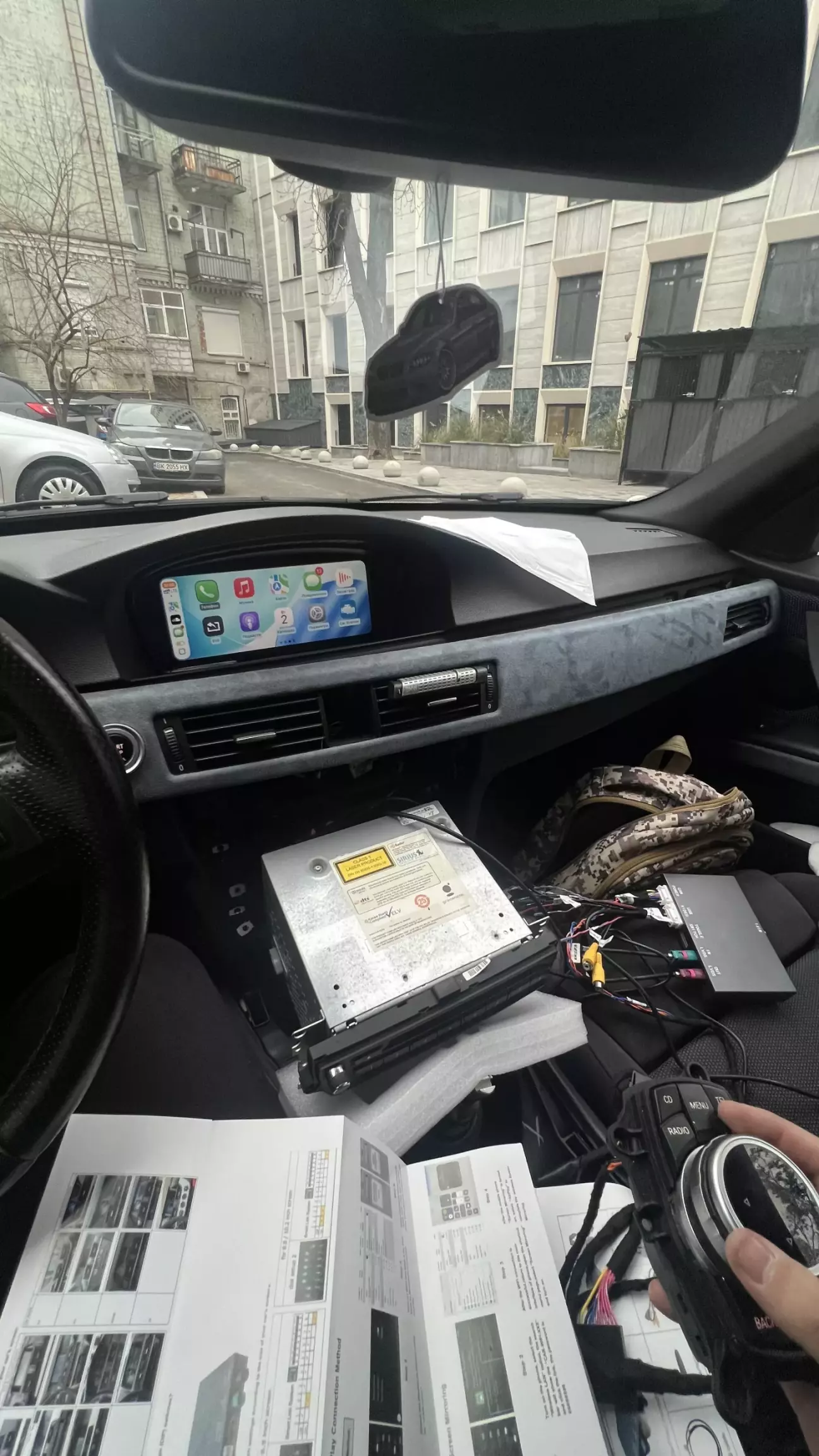 все налаштовано таким чином, що ніякі дроти під Aux не потрібно тягнути в підлокітник, мікрофон з комплекту CarPlay також не встановлювався, все працює від оригінального. Також доопрацював проводку під джойсткик, так як цей комплект йде на СІС на е90 та f серію, там були дроти з розʼємами під ф серію, тому вони були обережно вилучені з проводки, щоб просто так не валятись під консоллю.
