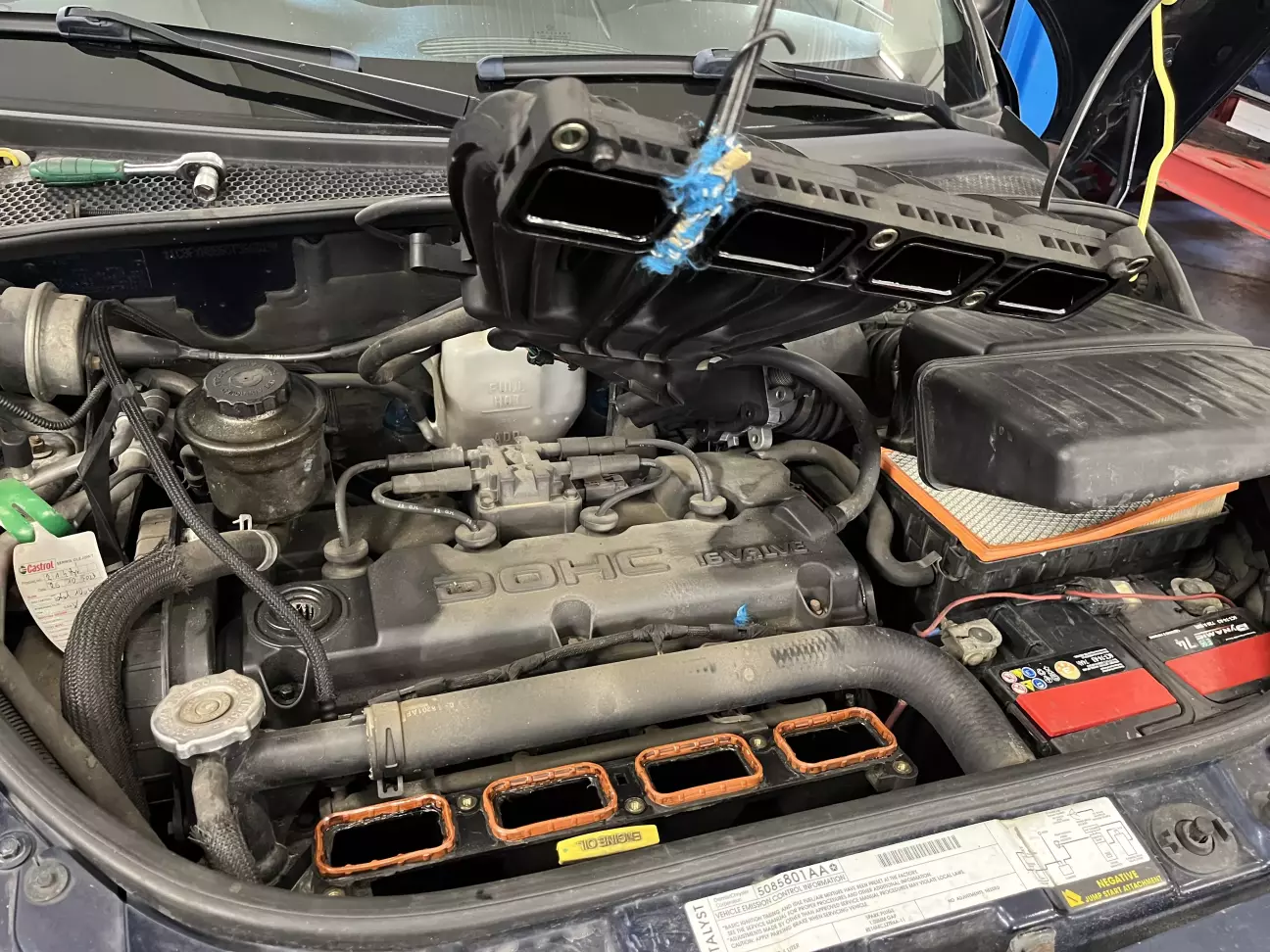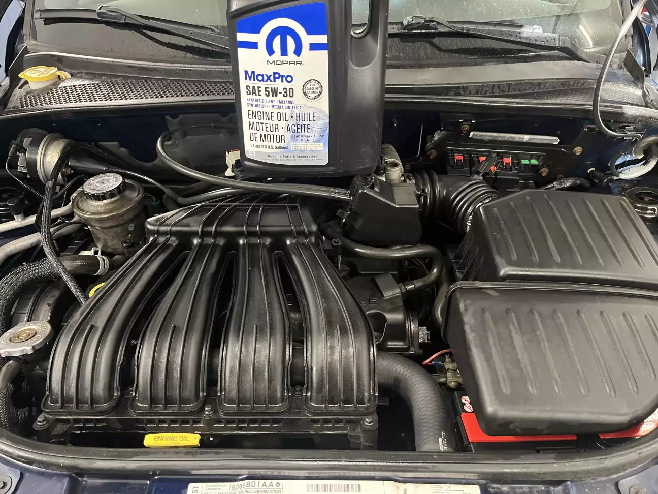 В процесі знайшов бірку від попередньої власниці, виходячи з якої оливу міняли трохи більше пʼяти тисяч км тому. Гарна новина! Але ж понад два роки минуло, тож Mopar 5W-30, ходь сюди до чистого двигуна.