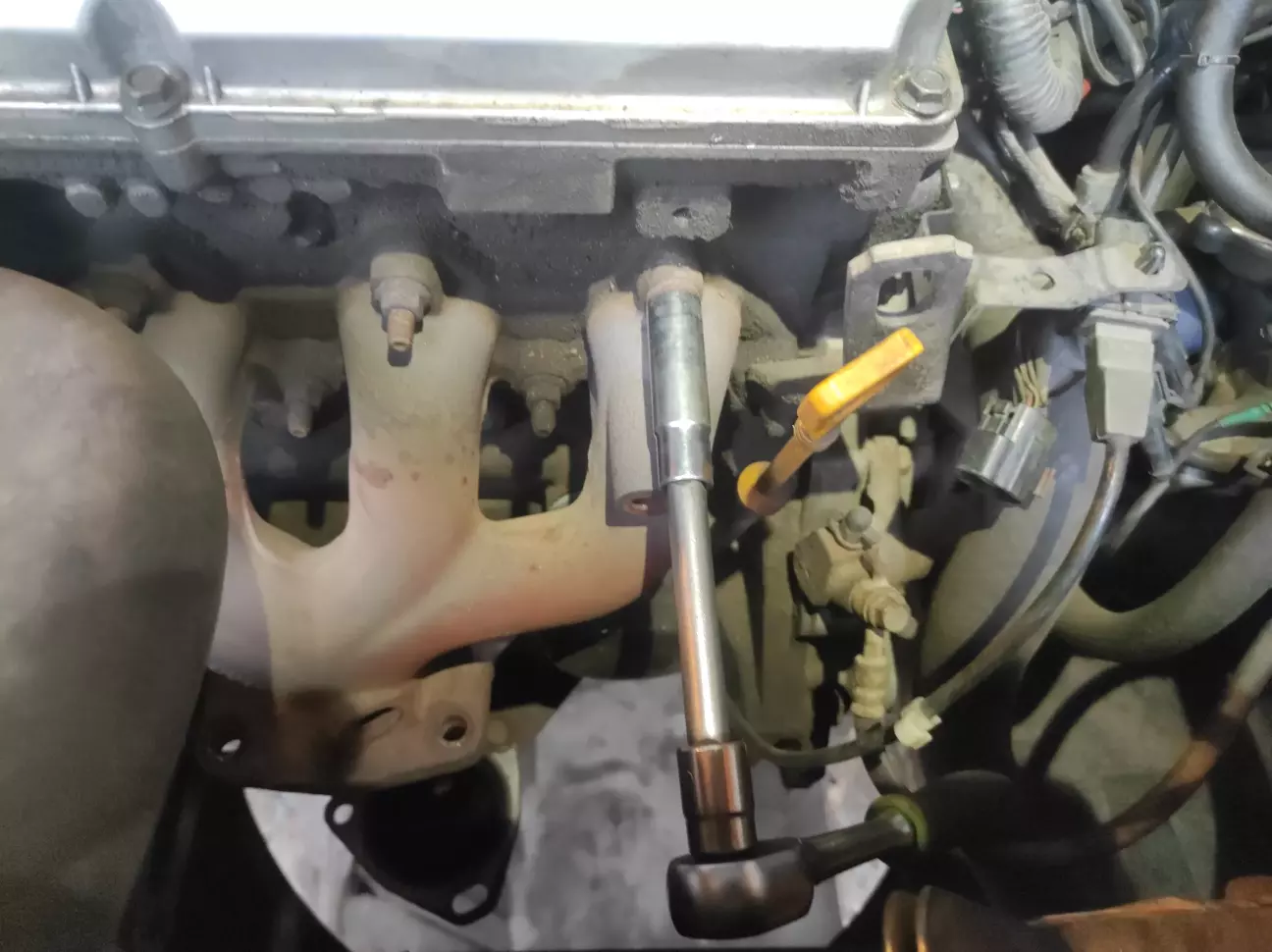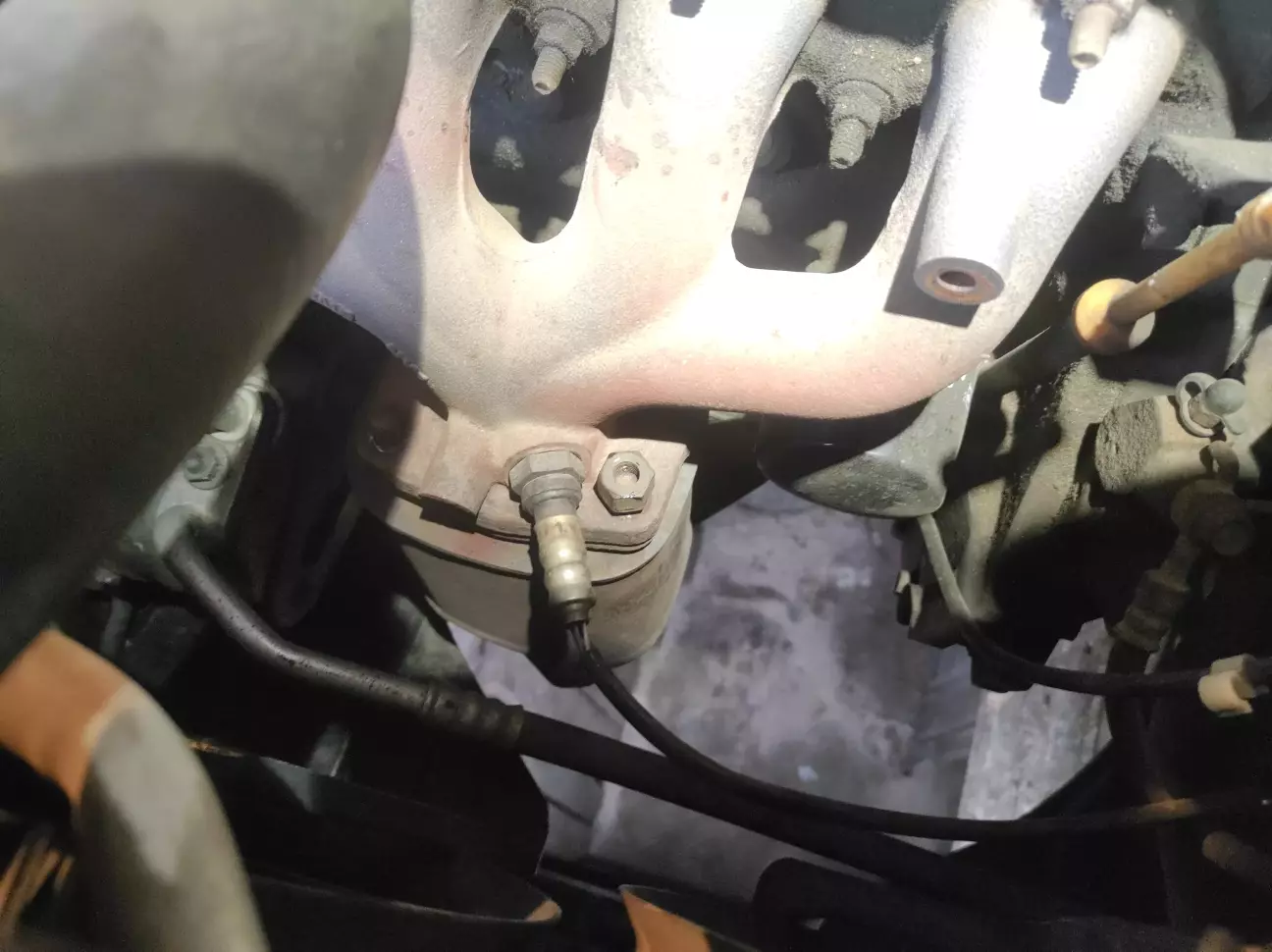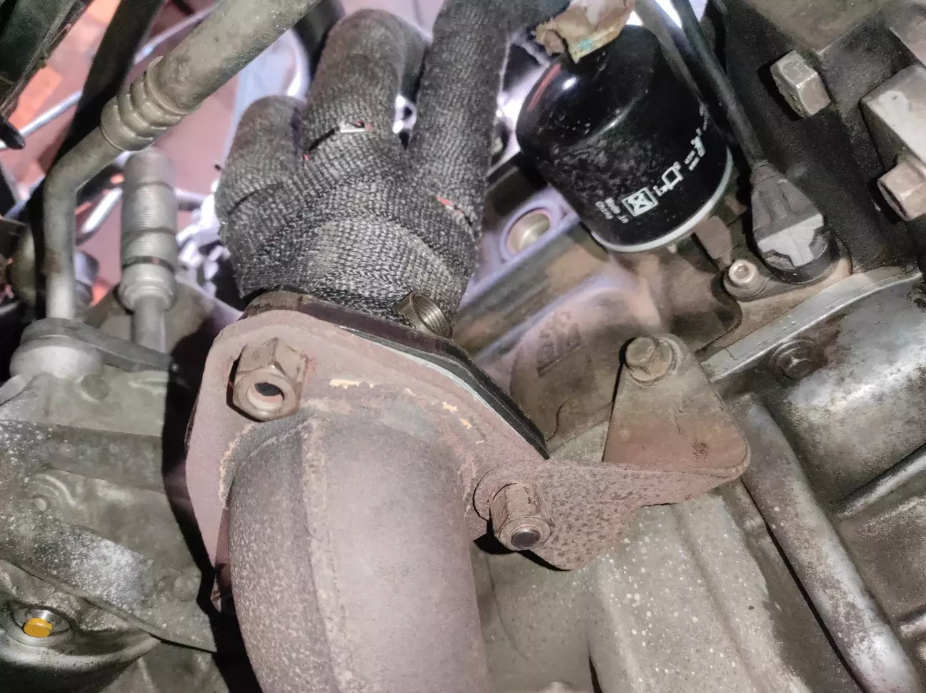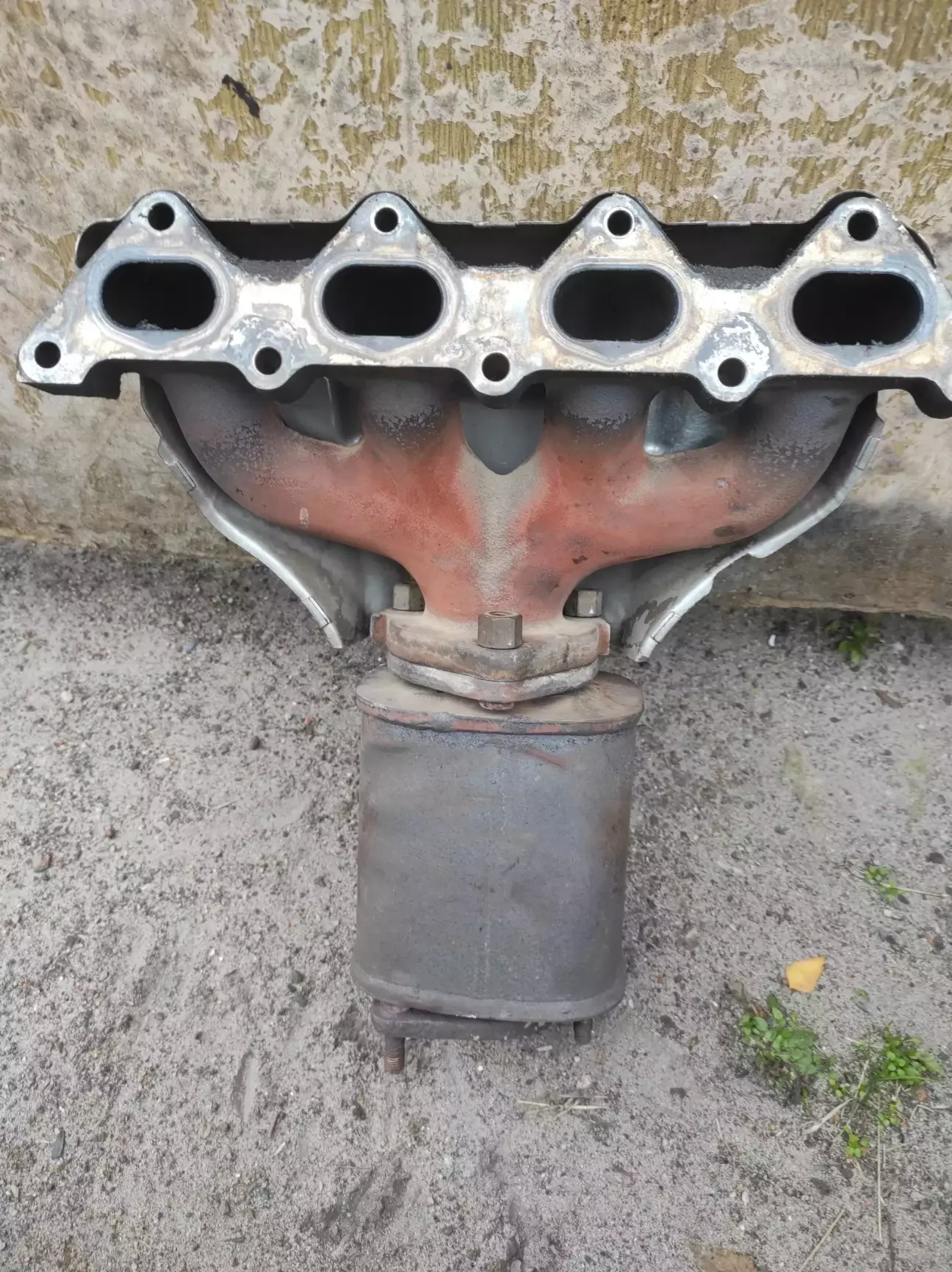 Колектор, якраз, охолонув, то ж я почав його демонтаж. Зняв термозахисний кожух, викрутив лямбду, відпустив гайки кріплення каталізатора як зверху, так і знизу: