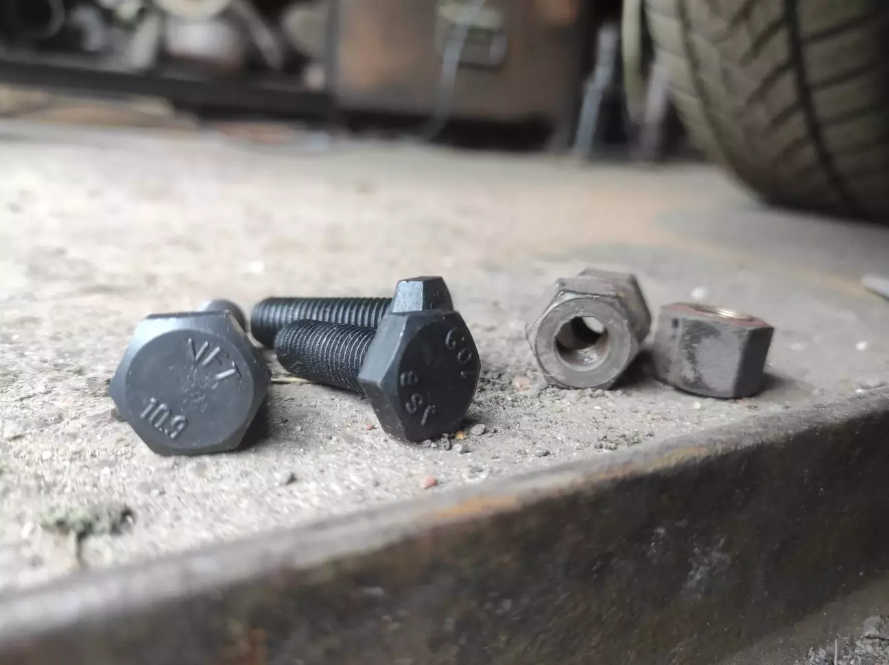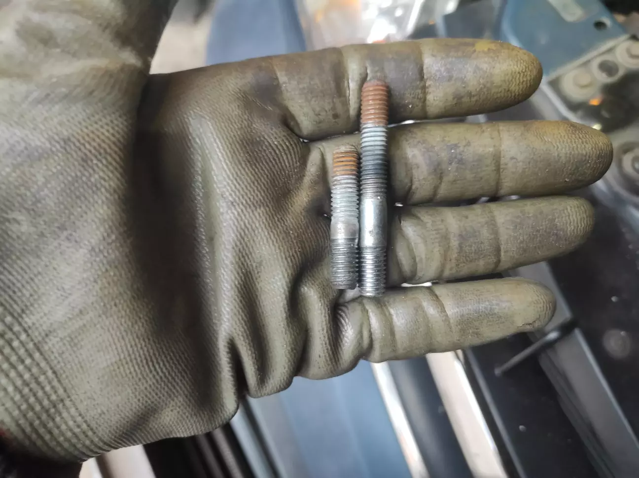Коли колектор був готовий і приїхав до мене, я, як завжди, в суботу зранку поїхав у гараж. Поки двигун охолоджувався, я мав нагоду зробити те, що вже давно муляло очі, а саме, дальні від передка кріплення декоратичної кришки... Не знаю, з яких міркувань інженери придумали ці кріплення зробити з болтів М6, які вкручуються напряму в алюмінієву клапанну кришку, адже передні її кріплення зроблені шпильками, що вкручені в кришку, а декор кріпиться до них гайками... Коротше, вже досить давно одна з різьб вже майже не тримала болт, бо була майже відсутня. Тому, взявши якусь моторну шпильку М6, яку прислав Макс разом з колектором, розпиляв її навпіл в розмір, зручний для накручування гайок, і посадив різьби на червоний фіксатор для нероз'ємних з'єднань: