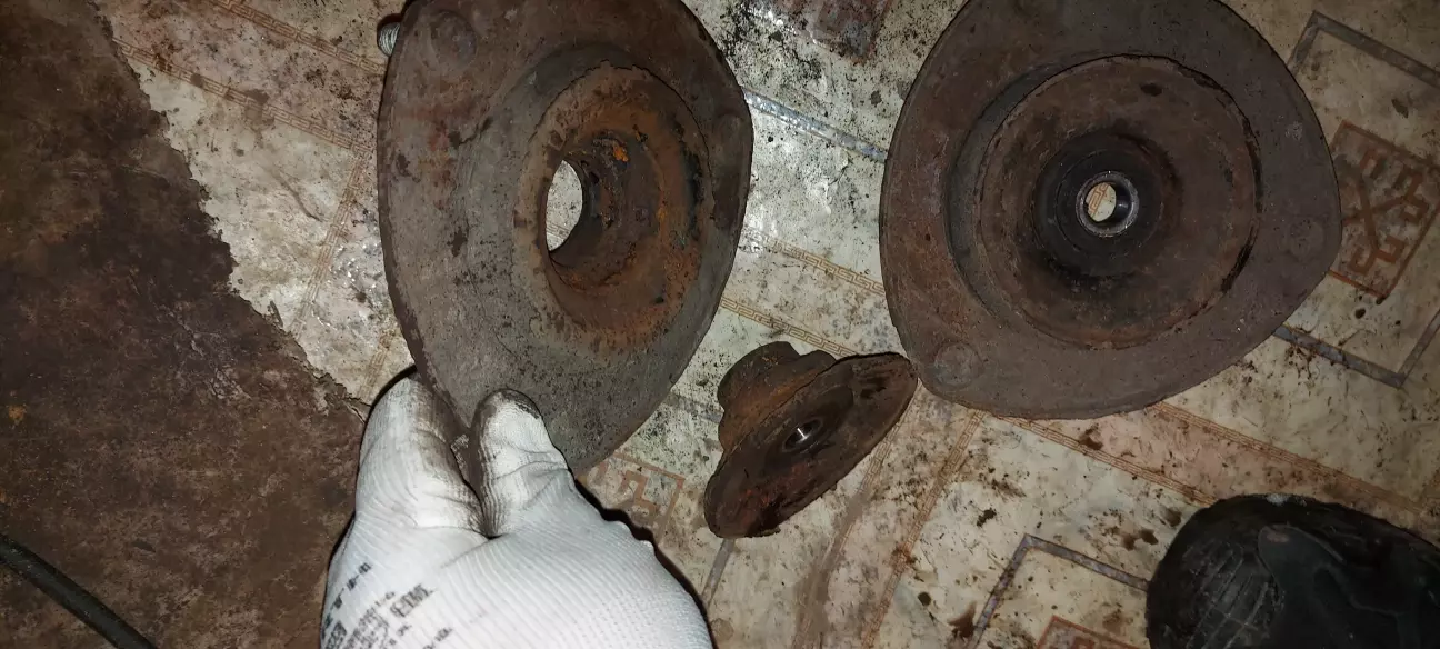 Приехал, бросил на СТО машину с запчастями. Звонок: привода прикипели к ступичным подшипникам, надо менять подшипники и гранаты внешние. Можно купить только привода в сборе, на это я не расчитывал, в итоге снимали всё с амортизаторами, чтоб оставить привода... Вывалился опорный подшипник, поменяли всё в HL Mando, сразу же лопнувшая пружина (Пока поставил одну, скоро буду менять аморты, сразу пружину вторую поставлю).