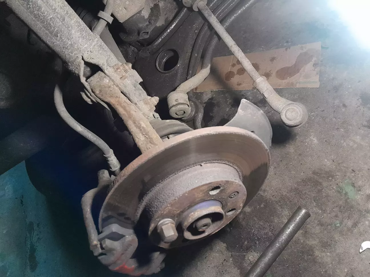 Далі збиваємо рульову тягу, відкручуємо і відводимо в сторону супорт, відкручуємо і знімаємо гальмівний диск, відкручуємо два болти стойки (ключ на 18), відкручуємо шарову опоруна вибір або три болтики малі, або один великий. Знімаємо кулак.