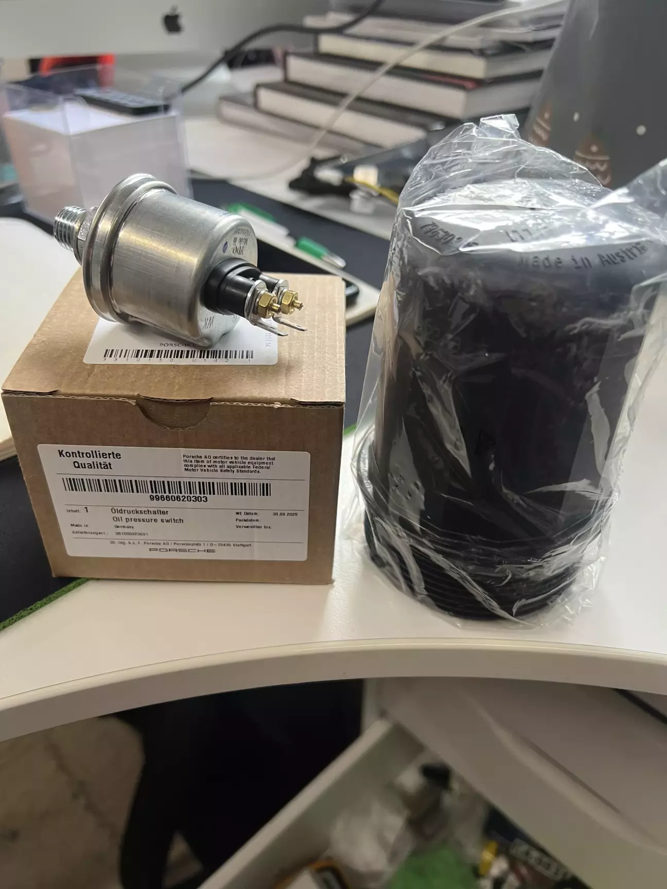 Мені завжди здавалось, що датчик тиску мастила показує якусь маячню (навіть після повного прогріву). Вірніше, трішки "не ті" цифри. Почитав розумних людей - кажуть, що "треба міняти". Купив ось новий - така олдскульна штука здорова. Якось поміняю, бо там і самостійно не дуже важко. Ну і щоб двічі не вставати, то купив фільтр з корпусом (мастила) на нову заміну. Оскільки старі запаси мастила вичерпано, через деякий час на мене чекає чудовий квест по вибору - не перемикаємось (911 їздив завжди виключно на Mobil1 0W-40 і ось востаннє на 5W-40. Мастила як не споживав між замінами, так і не споживає)