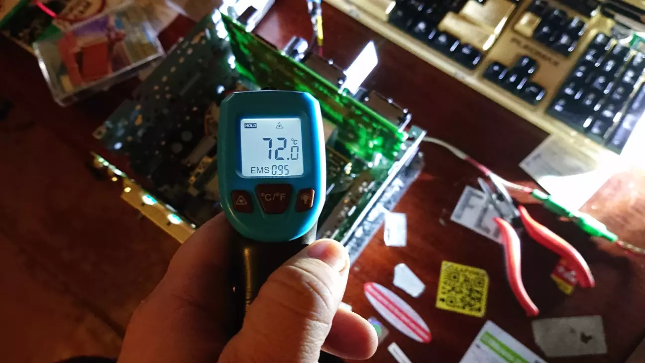 При перевірці один з підсилювачів нагрівся аж до 72°, можливо через те що був від'єднаний задній радіатор, (бо я спочатку розібрав а потім почав тестити).