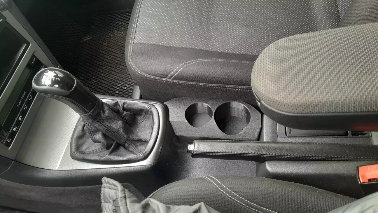 Має два місця під стаканчик з кавою) Це 3д друк, клеєне, тому по якості воно не дуже. Ліпиться на двохсторонній скотч, і думаю , якщо човгати пасажирською сідухою взад-вперед, то скоро відпаде.
