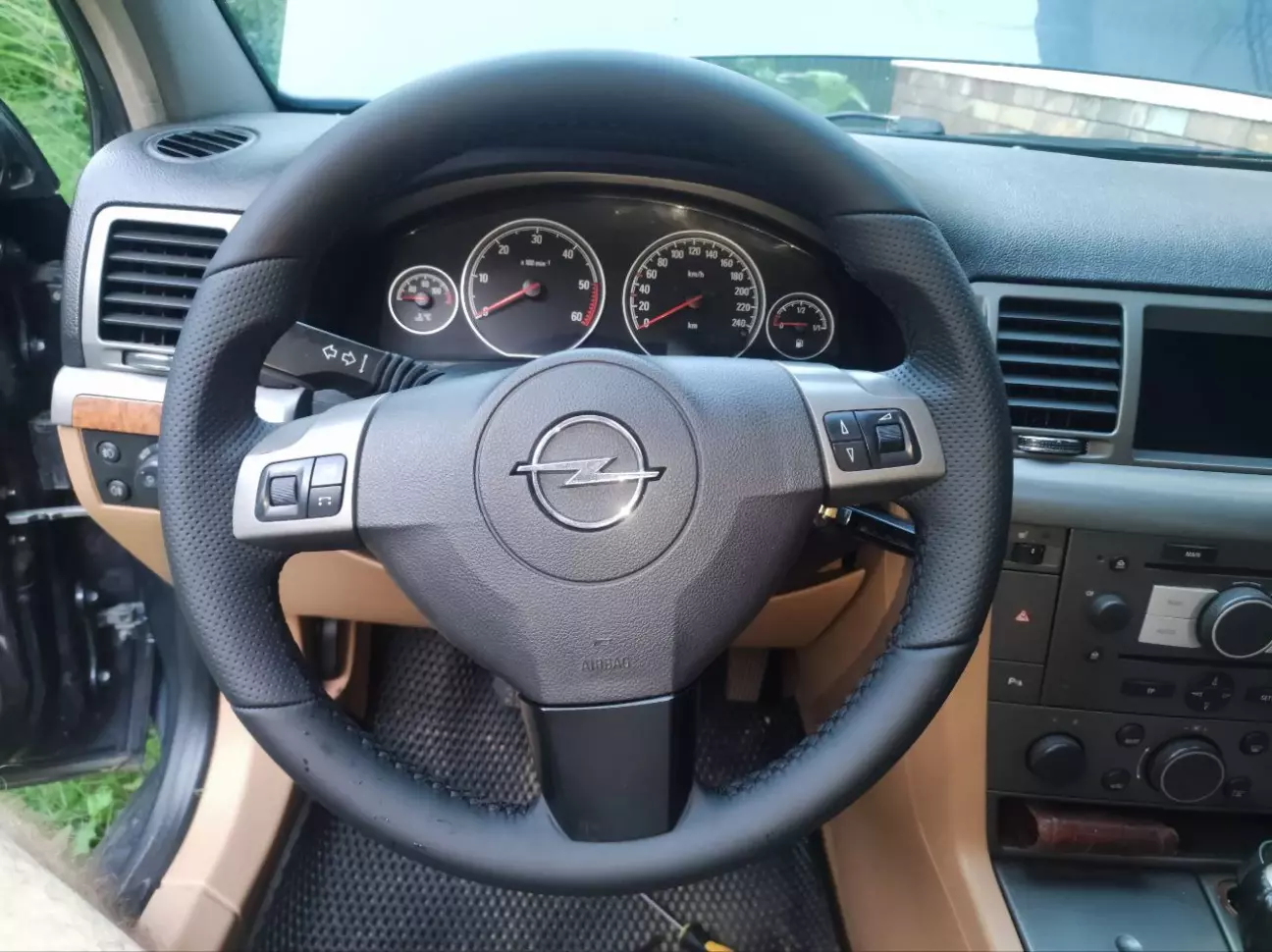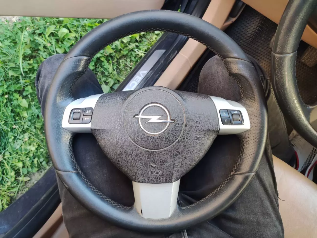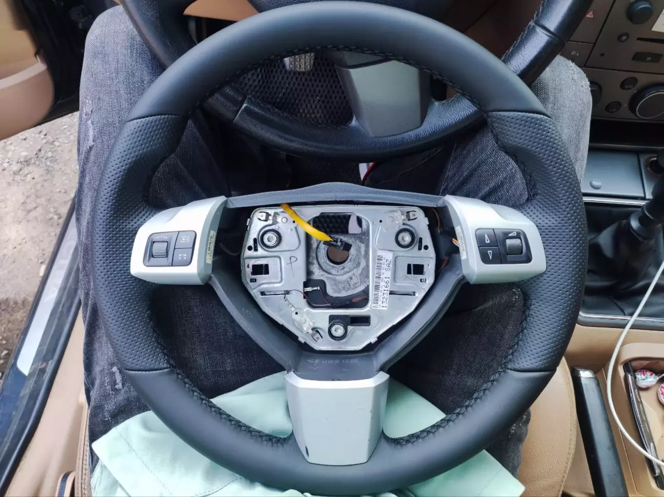 Було куплено за хорошу ціну кермо із зафіри в досить поганому стані, відразу віддано на перетяжку. При встановленні виявив, що кермо менше в діаметрі і нижня пластикова заглушка із рідного керма не підходить, в результаті чого була з балончика пофарбована в чорний колір. При подальшому встановленні виявилось шо піни на айрбег із зафіри відрізняються, тому замінив металеву пластину із центра керма, яка кріпиться трьома гвинтами, після чого встановив кермо на своє місце.