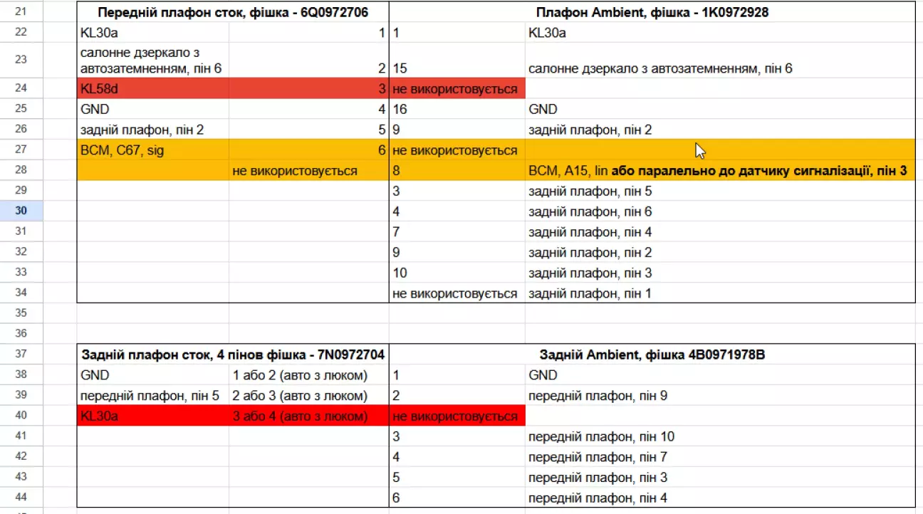 Таблиця перепінування фішок старого і нового плафону наступна (до речі, таблиця складена особисто мною виходячи з аналізу схем підключення):