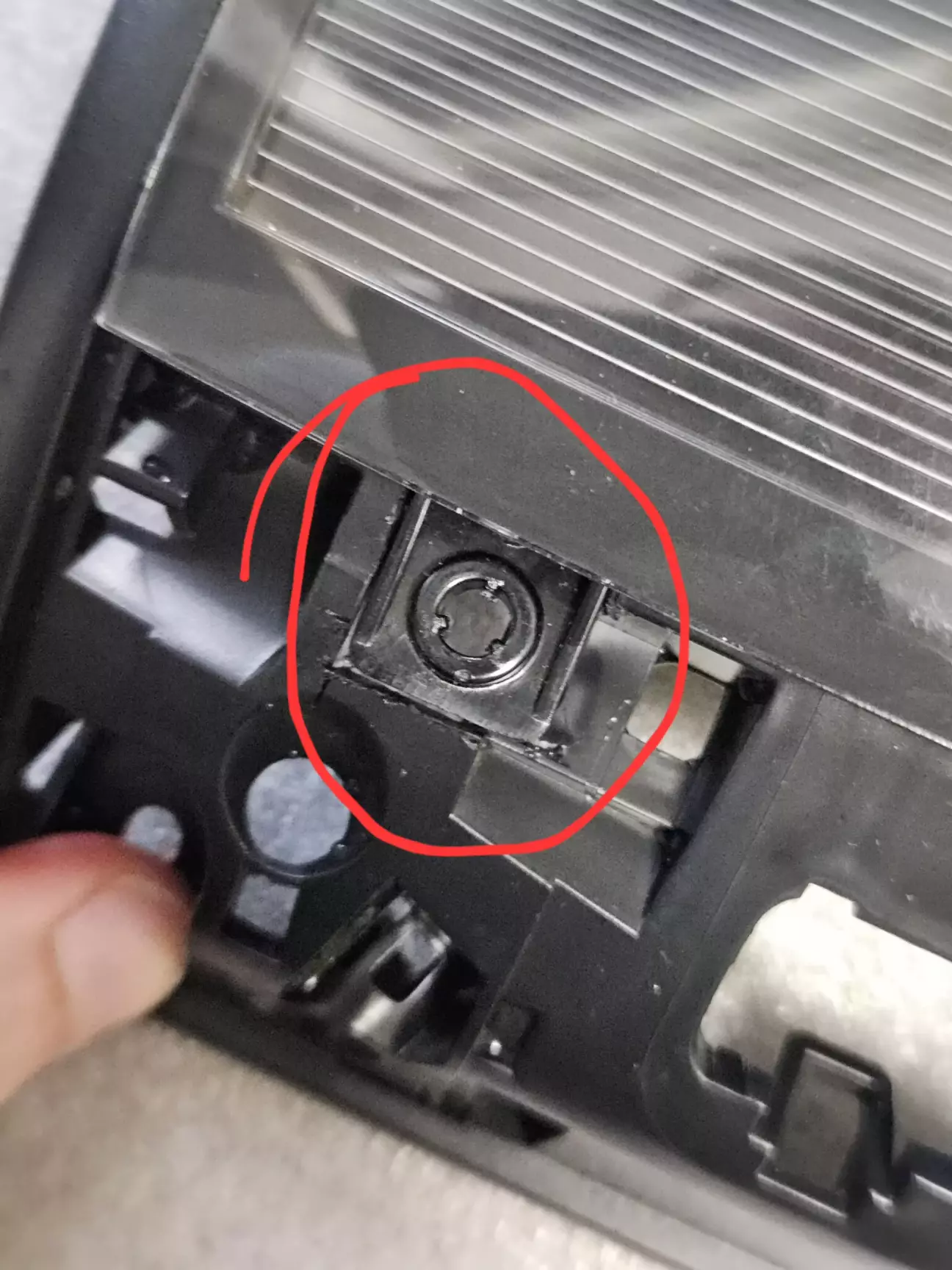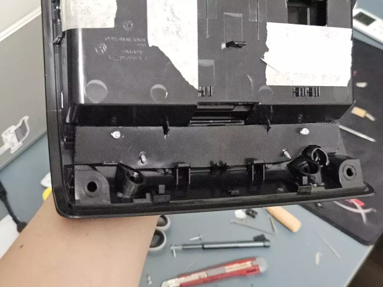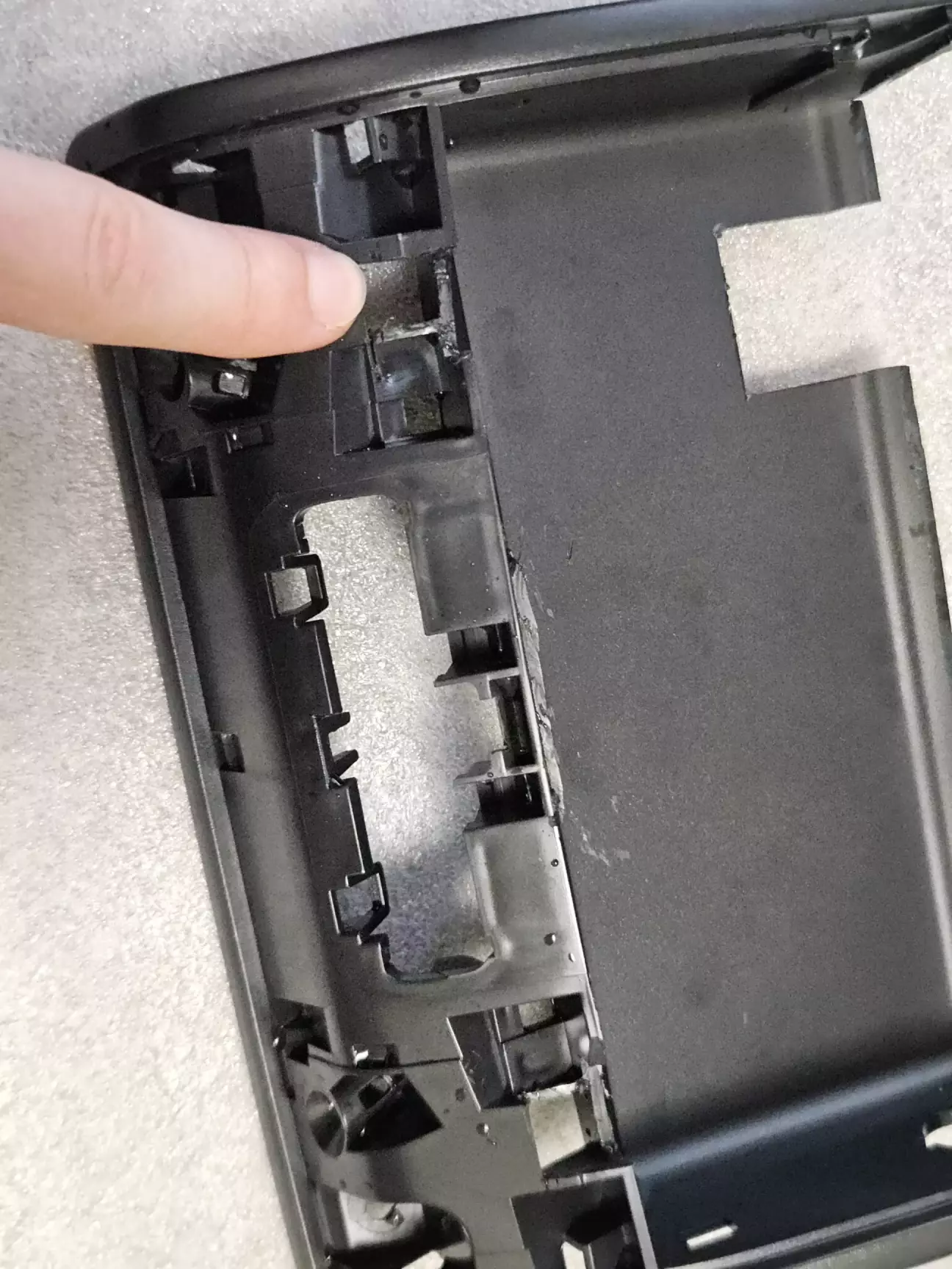 Спочатку відпилюємо дремелем весь зайвий паластик, і помічаємо головну проблему - відсутність пластику, де мають кріпитися вуха плафону до рамки саморізами: