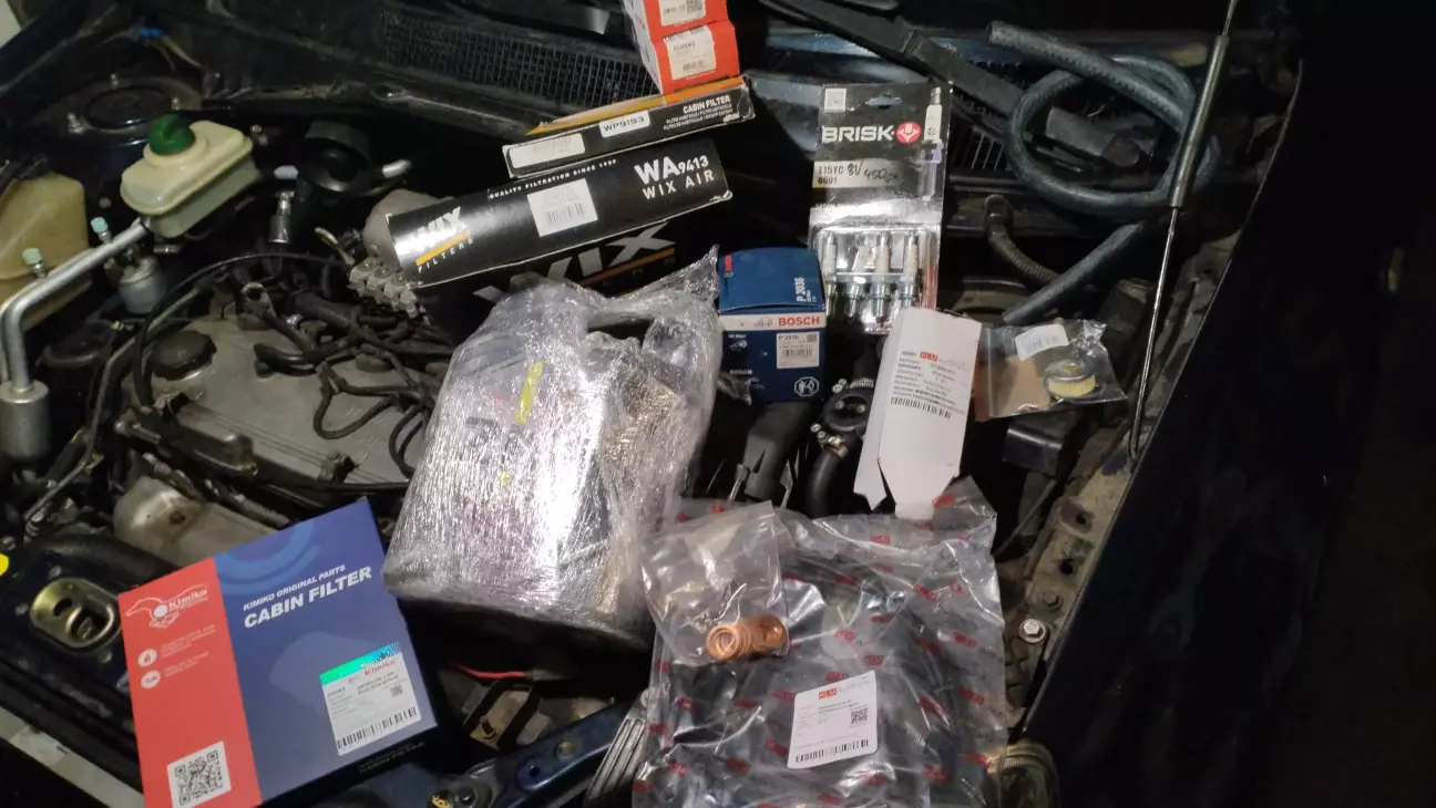 На цю то-шку я планував окрім оливи та фільтрів, замінити ще й ВВ дроти, свічки та стійки заднього стабілізатора. Закуплятися почав ще за місяць до проведення. І так спішив, так спішив що аж провтикав придбати свічки, фільтр газового сепаратора та ущільнюче кільце на пробку піддона.