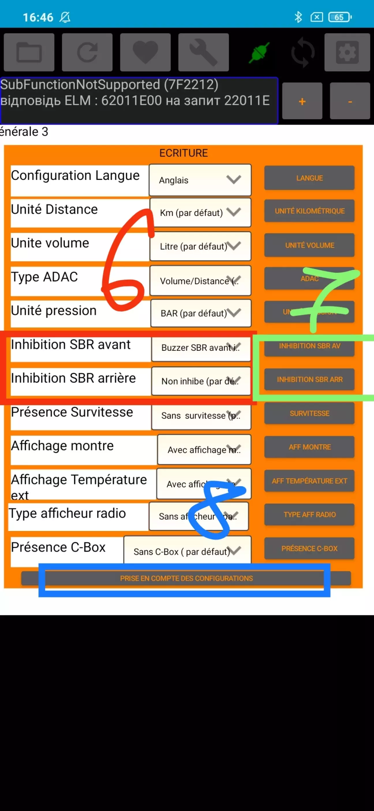 6)свайпаєм екран вбік і бачимо що можемо корегувати параметри , в попередньому розділи ми розібрали які строчки відповідають рядності сидинь , хтось вимикає обидва , я вирішив тільки відключити передні тому міняю параметр у випадаючому віконці в Inhibition SBR avant - Buzzer SBR avant inhibe