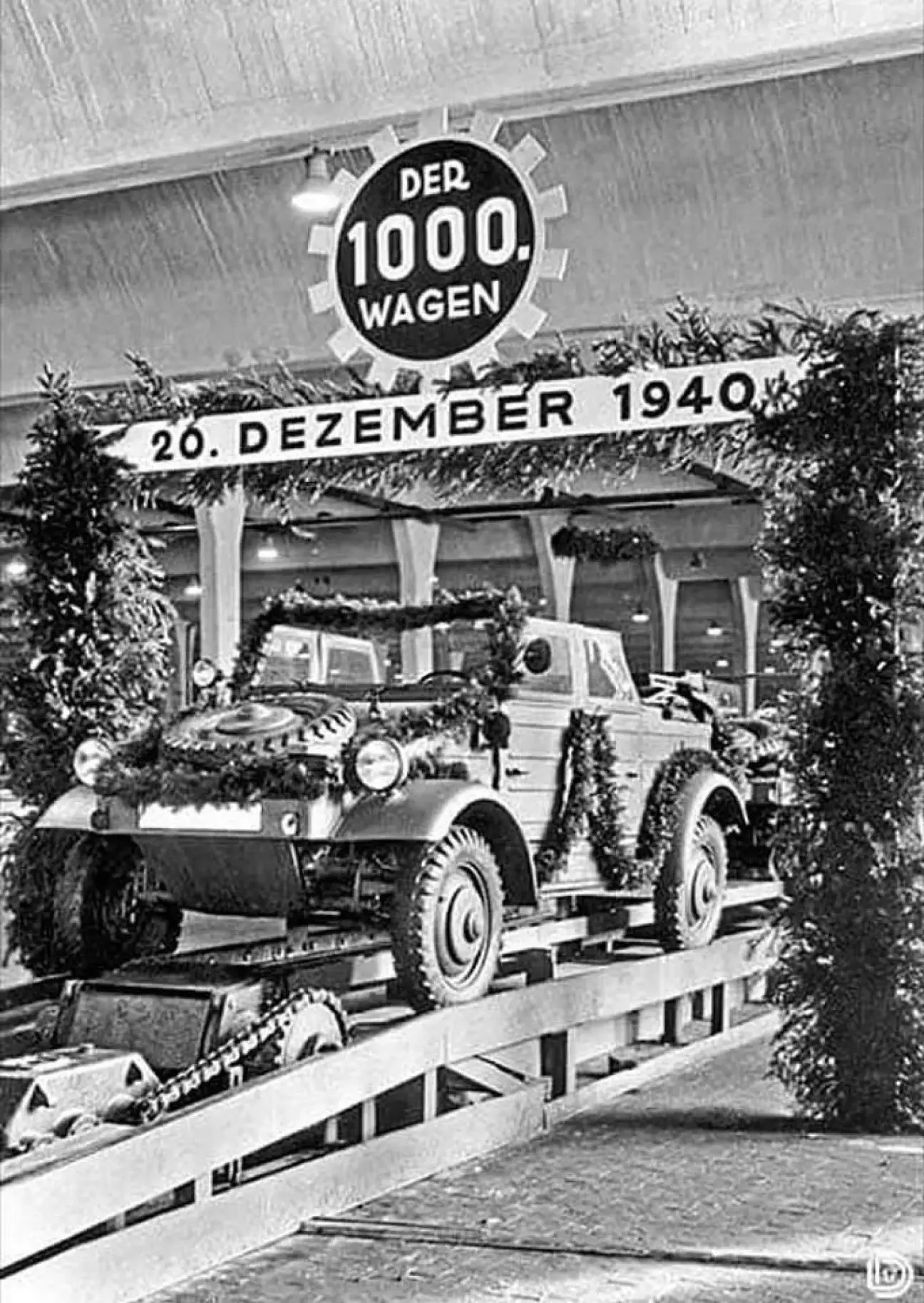 85 років тому цього дня: Kübelwagen номер 1000 був виготовлений на заводі Stadt des KdF-Wagens поблизу Фаллерслебена (сьогодні — Вольфсбург) 20 грудня 1940 року.