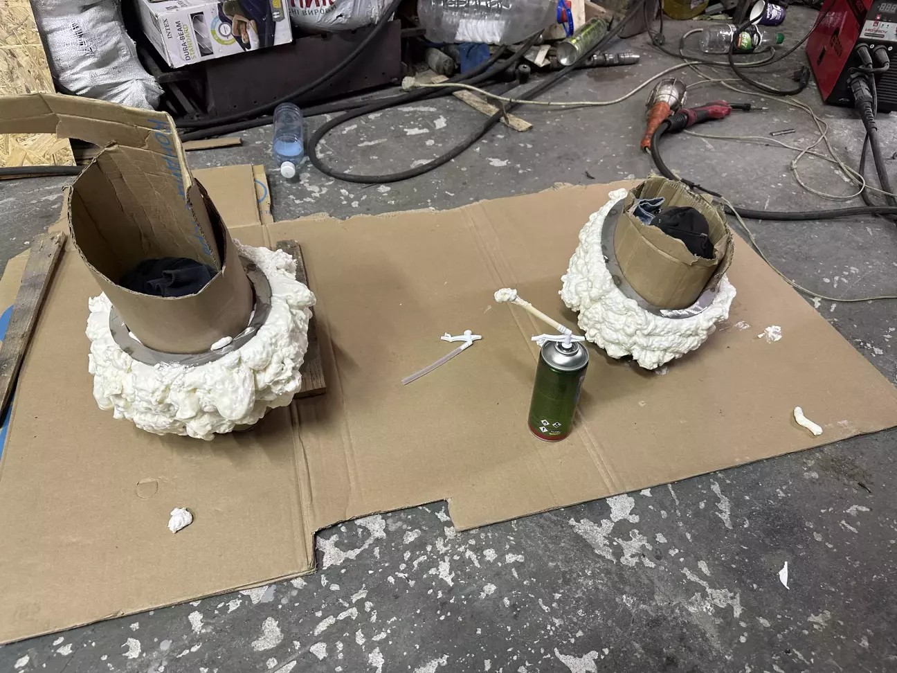 далі я на каркас подіуму накрутив металеву сітку, вставив в середину картон а на зовнішню поверхню наніс монтажну піну