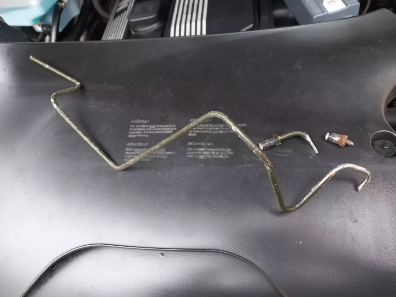 Ліву трубку довжиною 751мм вирівнюємо, і гнемо по зразку зі старої трубки. Спеціальний ключ для гнуття трубок я купив, ще коли міняв всі трубки на своїй E30. Обмотав його "антискрипом", щоб не дряпати захисне полімерне покриття трубок.
