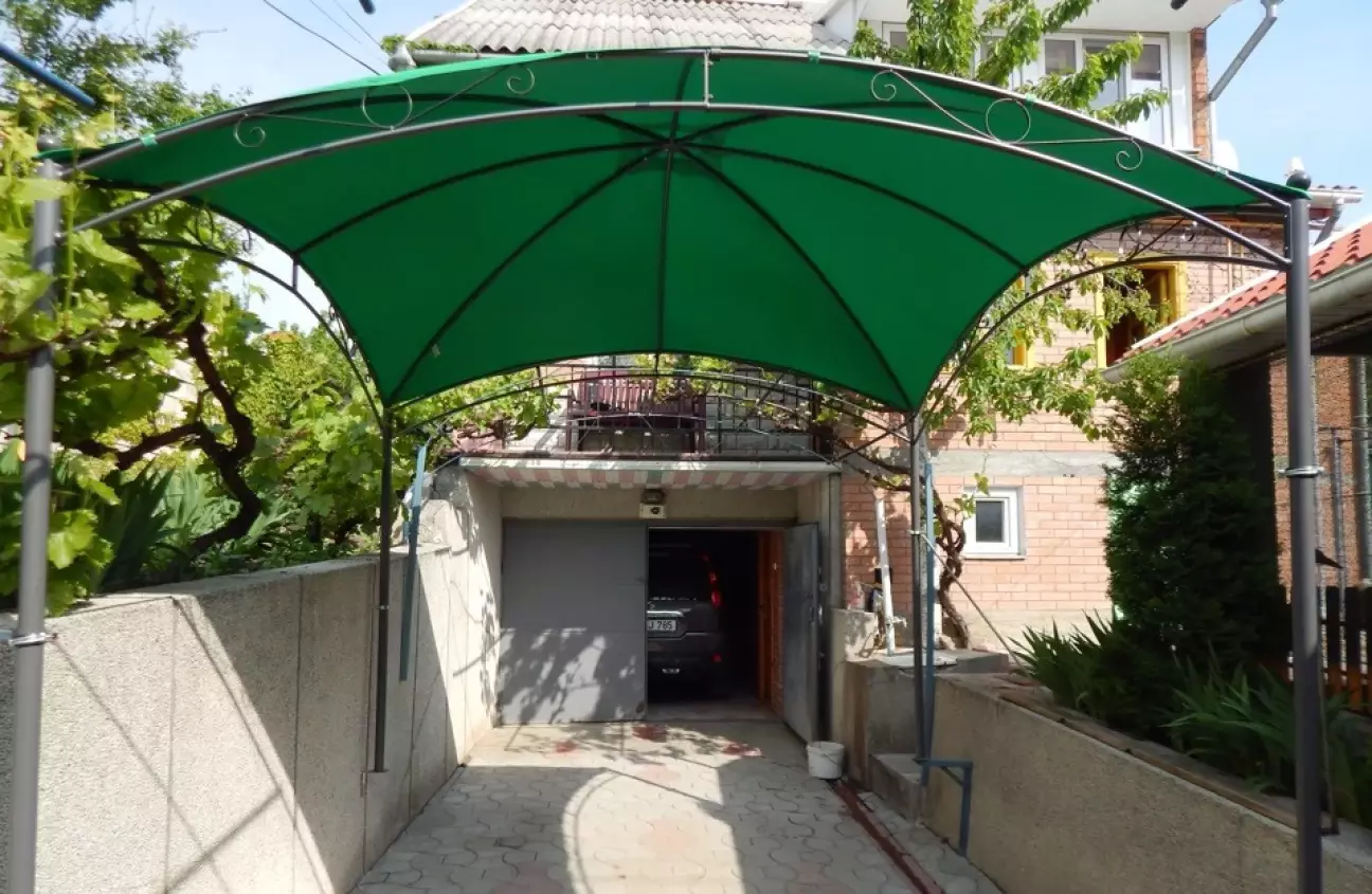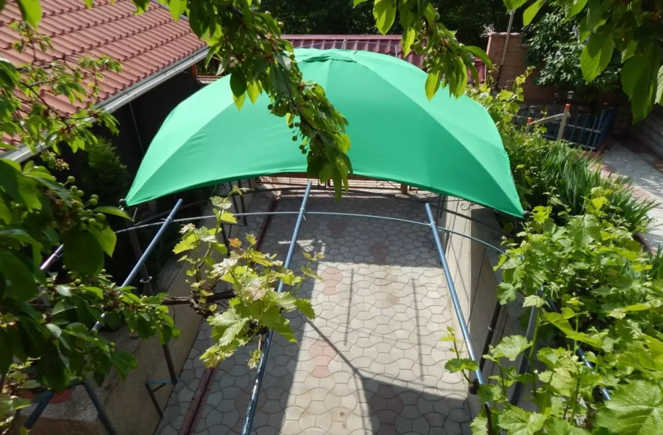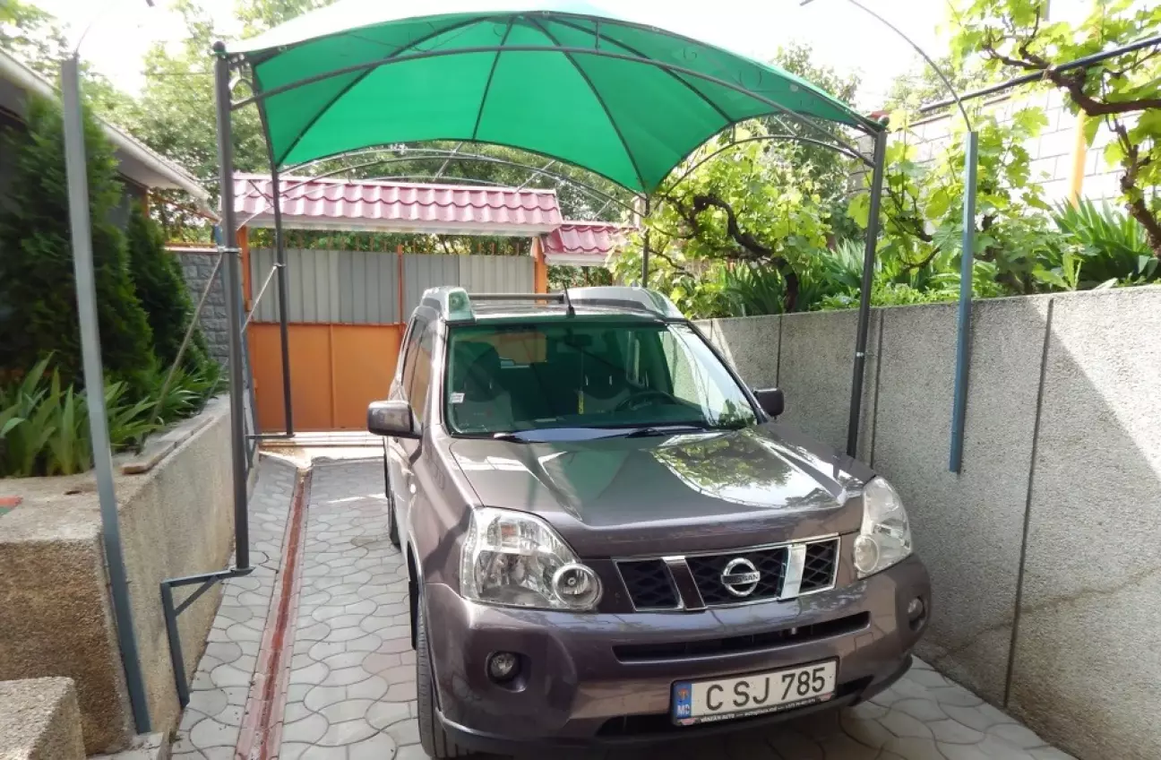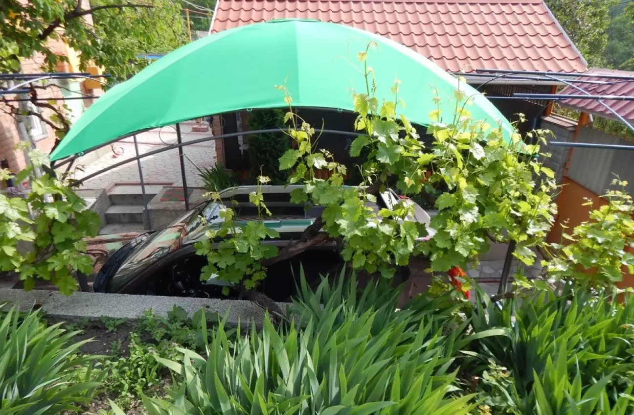 Ее внешний вид начинает удручать Для решения проблемы решил не вырубая винограда создать навес для машины Не имея много времени решил купить готовый павильон Изначально размеры двора и навеса не совпадали С помощью самодельных кронштейнов удалось выйти из тупика Как получилось покажу на фото