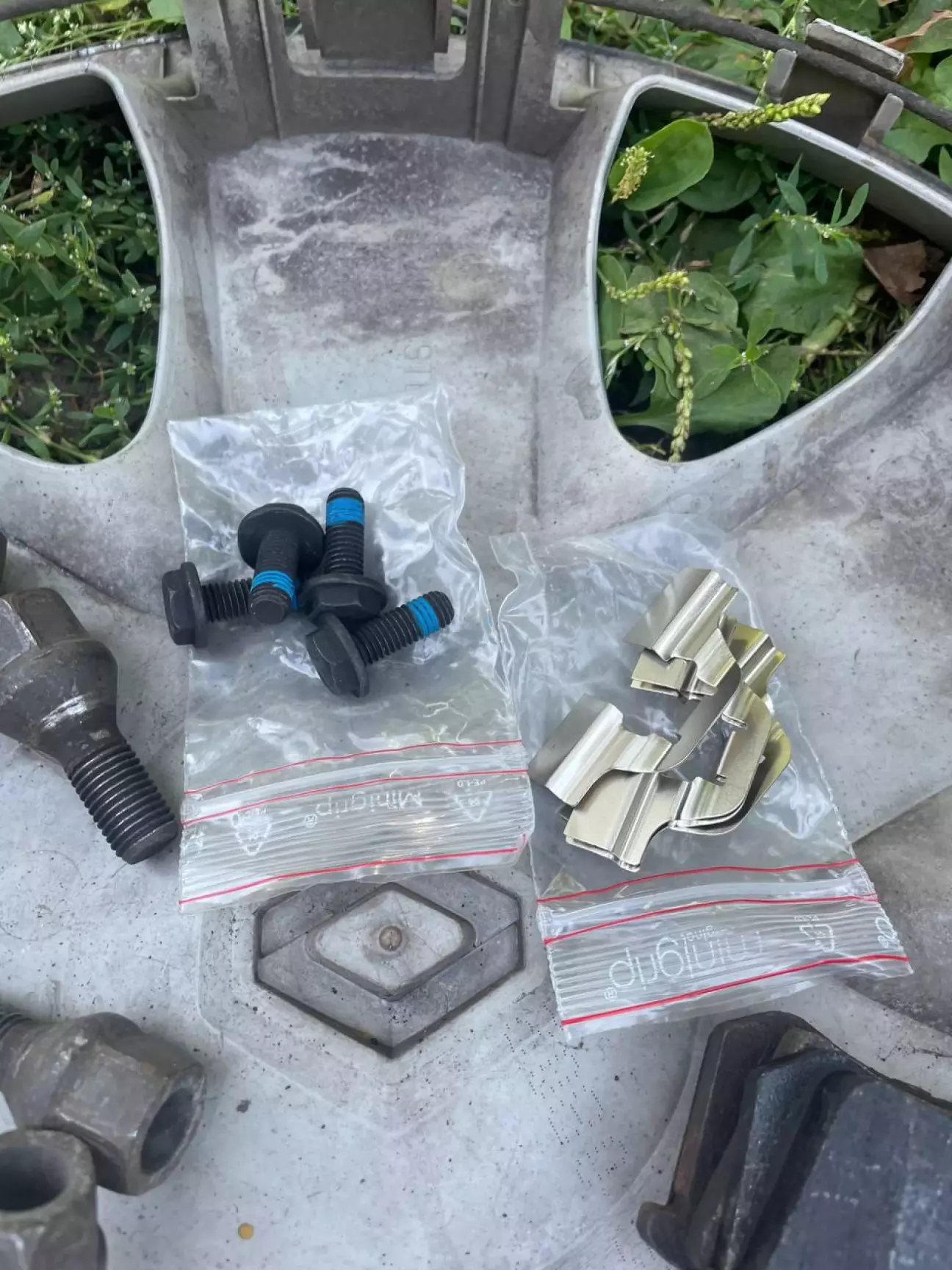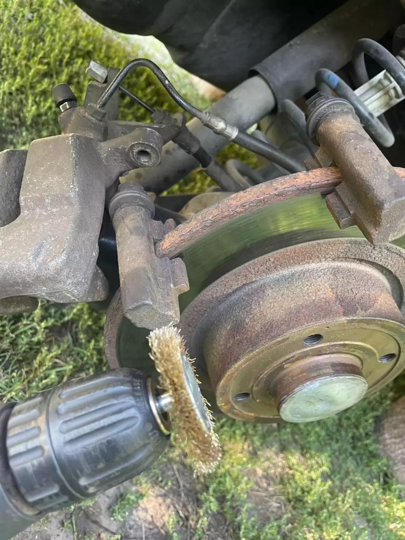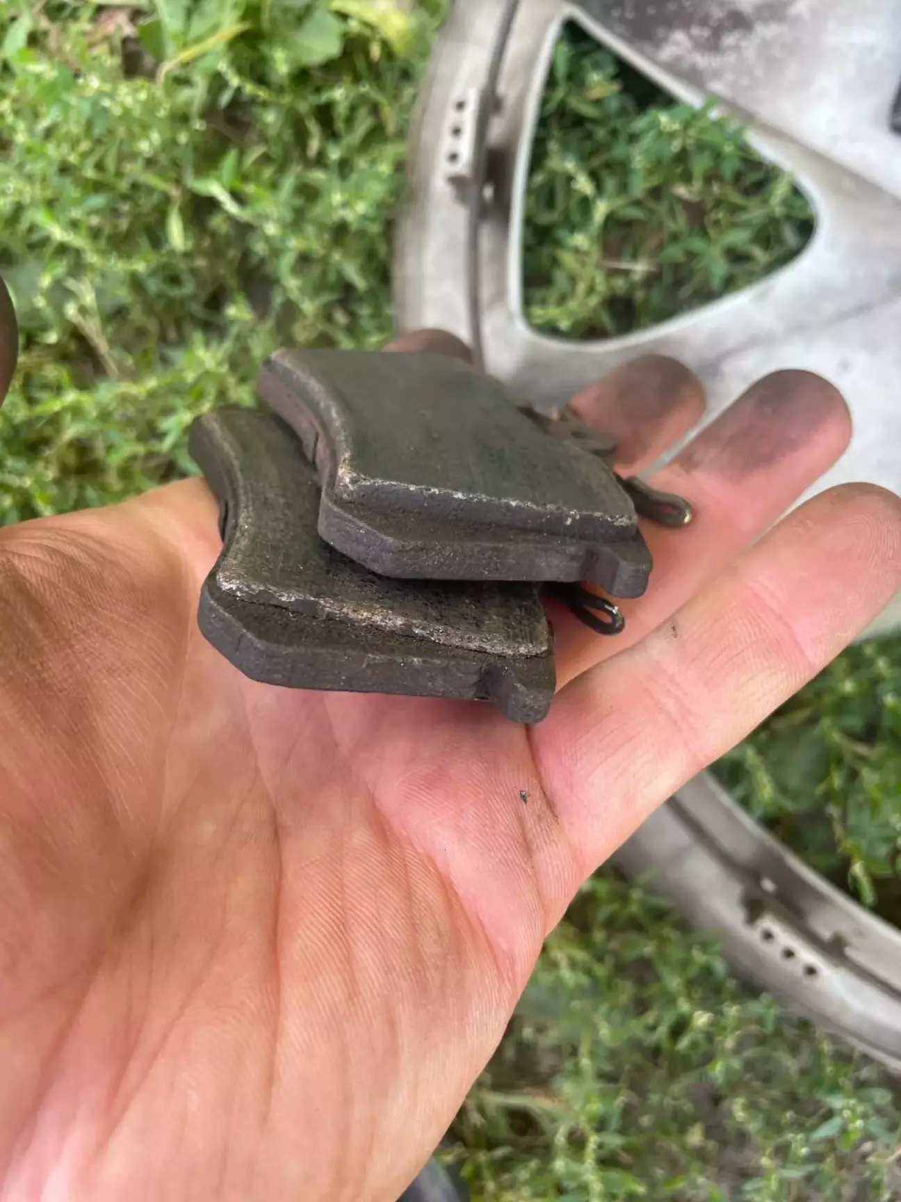 Заодно замінили задні колодки. Там ще теж історія. Задні поршні не можна просто втиснути, потрібно втискати з проворотом, тому вправа в 4 руки з підручними приспособами у вигляді старого великого підшипника, болта, гайок і проскогубців наледве допомогла втиснути поршні та встановити новенькі колодки. Надалі раджу обзавестися набором інструментів для заміни колодок, це набагато ефективніше.