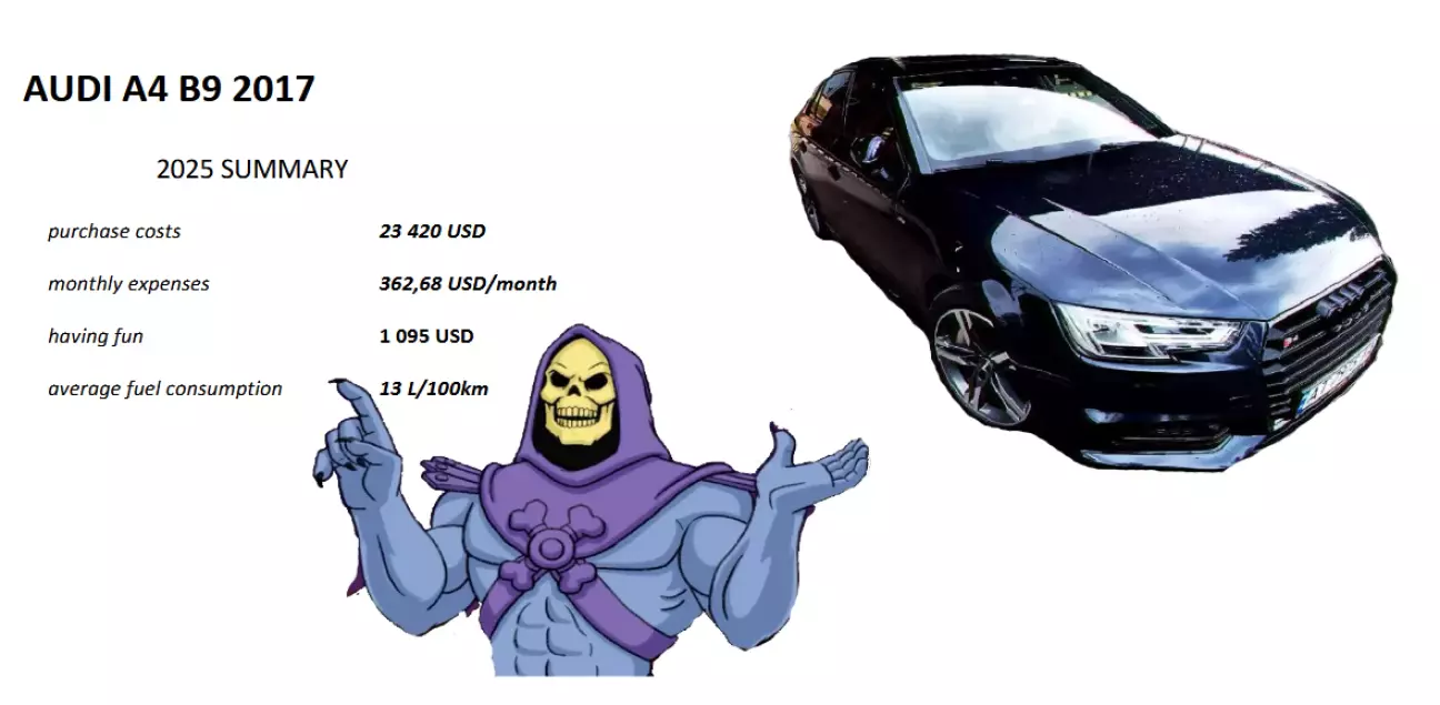 Підбиваючи підсумки 2025 року (а я люблю підбивати підсумки), стало мені цікаво, в яку ж суму мені стала цьогорічна авантюра з пересадкою із Chrysler 200, на Audi A4 і чи варто воно того було?