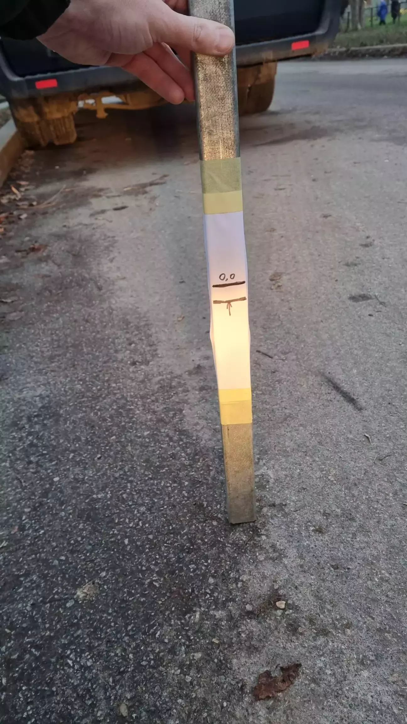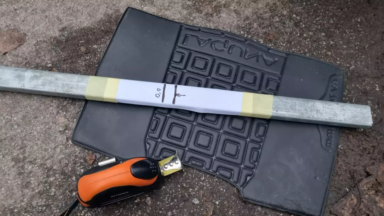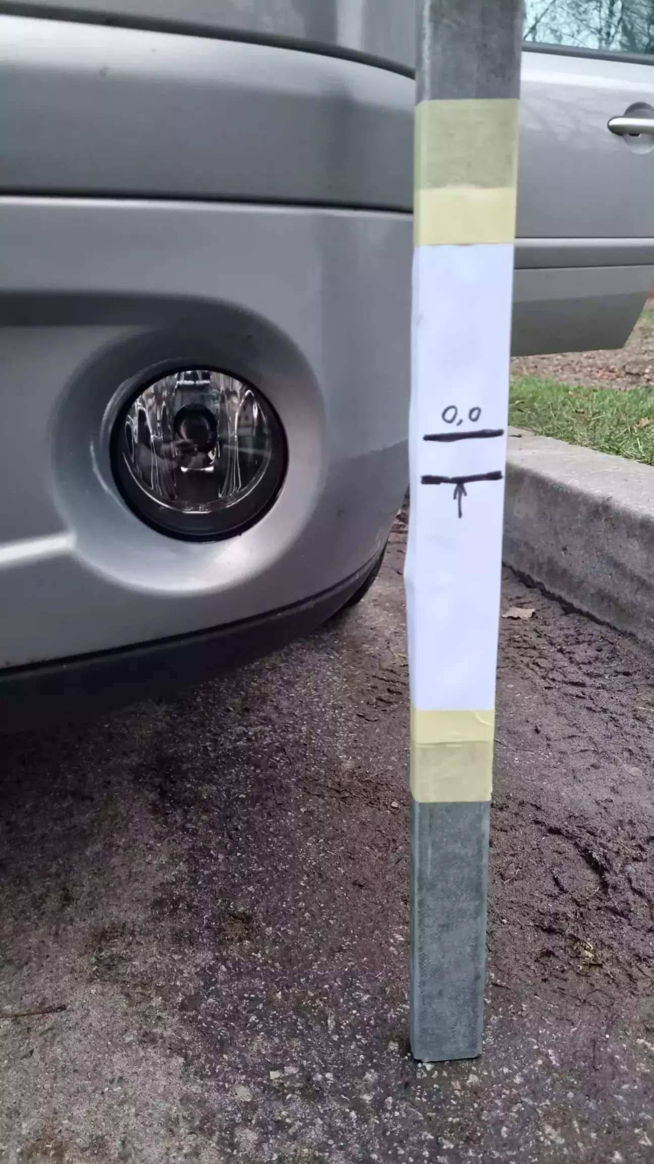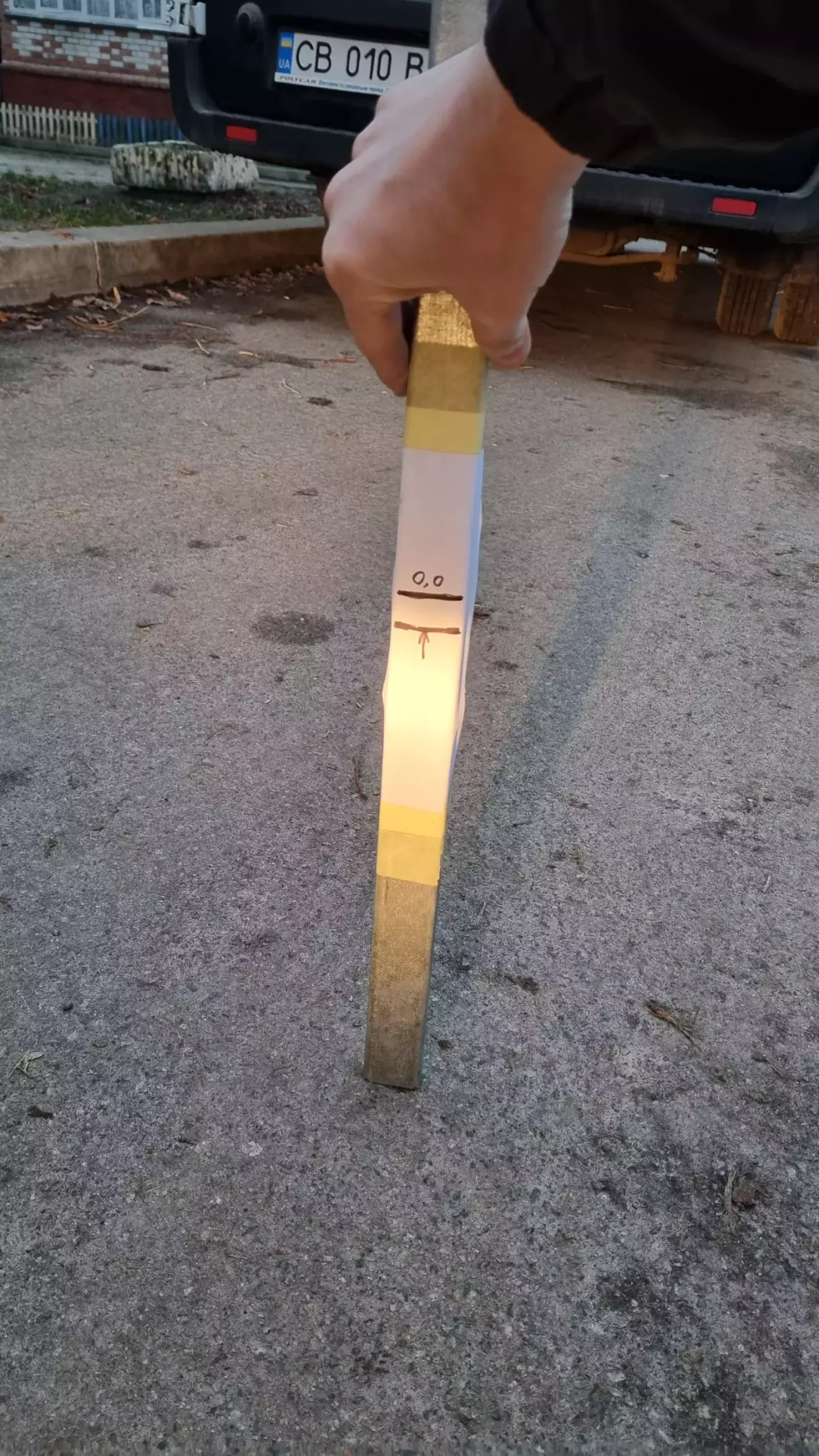 Зажурився був, написав тому майстру. Каже, приїжджайте, порегулюємо. Та шо ж, думаю, регулювати, якщо одразу не туйво.. Аж вихід знайшовся - погуглив, виявляється, у бамперах є технологічні отвори, завдяки яким викруткою можна регулювати висоту. З підручних засобів, а саме шматка труби, викрутки, рулетки та маркера змайстрував мірну палку.
