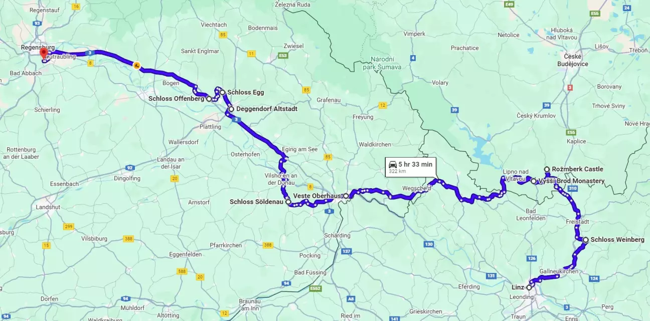 Після цього ми заїхали подивитися на замок Егг, який вперше згадується у 1103му р. як резиденція Тьємо де Екке. Комплекс було відреставровано між 1838 і 1842 рр. за часів графа Йозефа Людвіга фон Армансберга під керівництвом архітектора Людвіга Фольца з Регенсбурга. Під час цієї реконструкції колишні господарські будівлі та пивоварня були знесені. Замок також був прикрашений орнаментами в середньовічному стилі, такими як фронтони, балкони та башти. У 1839му р. старий дерев'яний міст було знесено та замінено мостом, що складається з кількох кам'яних арок. У 1939му р. промисловець і китайський консул Йозеф Максиміліан Гартль придбав замок без господарських земель і сьогодні замок належить його родині.