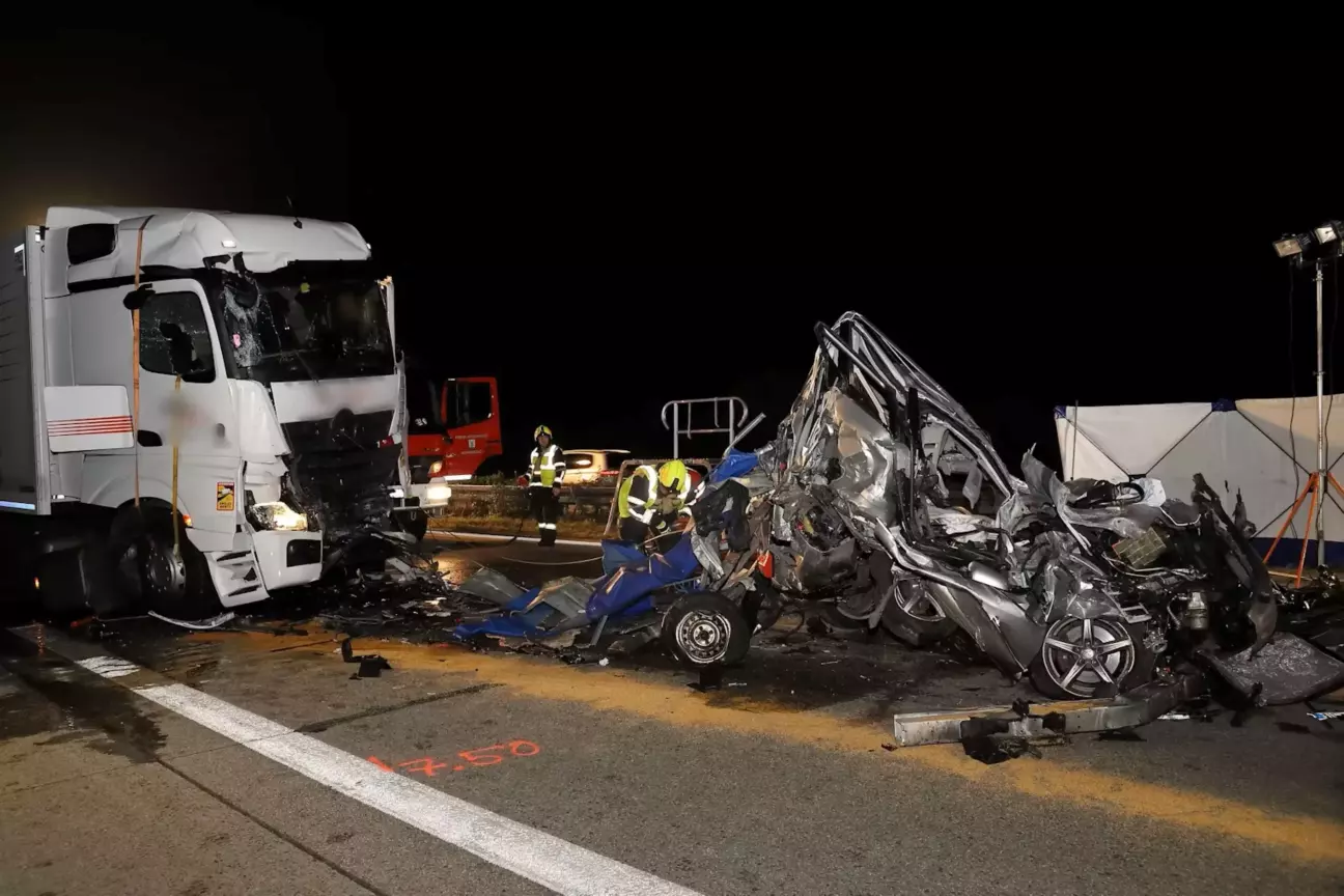 Отак дорожники перекривали нашу частину автобана теж, одна вантажівка зупинилася в крайньому правому ряду, за нею мікроавтобус із легковиком на лафеті, а от водій наступної вантажівки просто не помітив кінця корку і запресував буса з легковиком прямо в попередню вантажівку. Гадаю, по фото і так ясно, що шансів вижити там не було ніяких... На житло ми заїхали по 12й годині ночі, коли діти вже непонано так виспалися в корку...