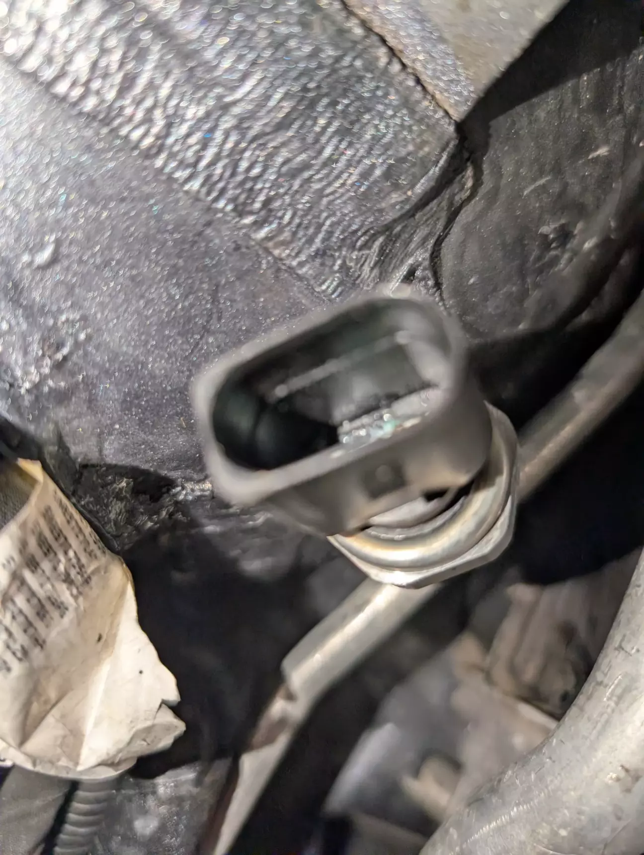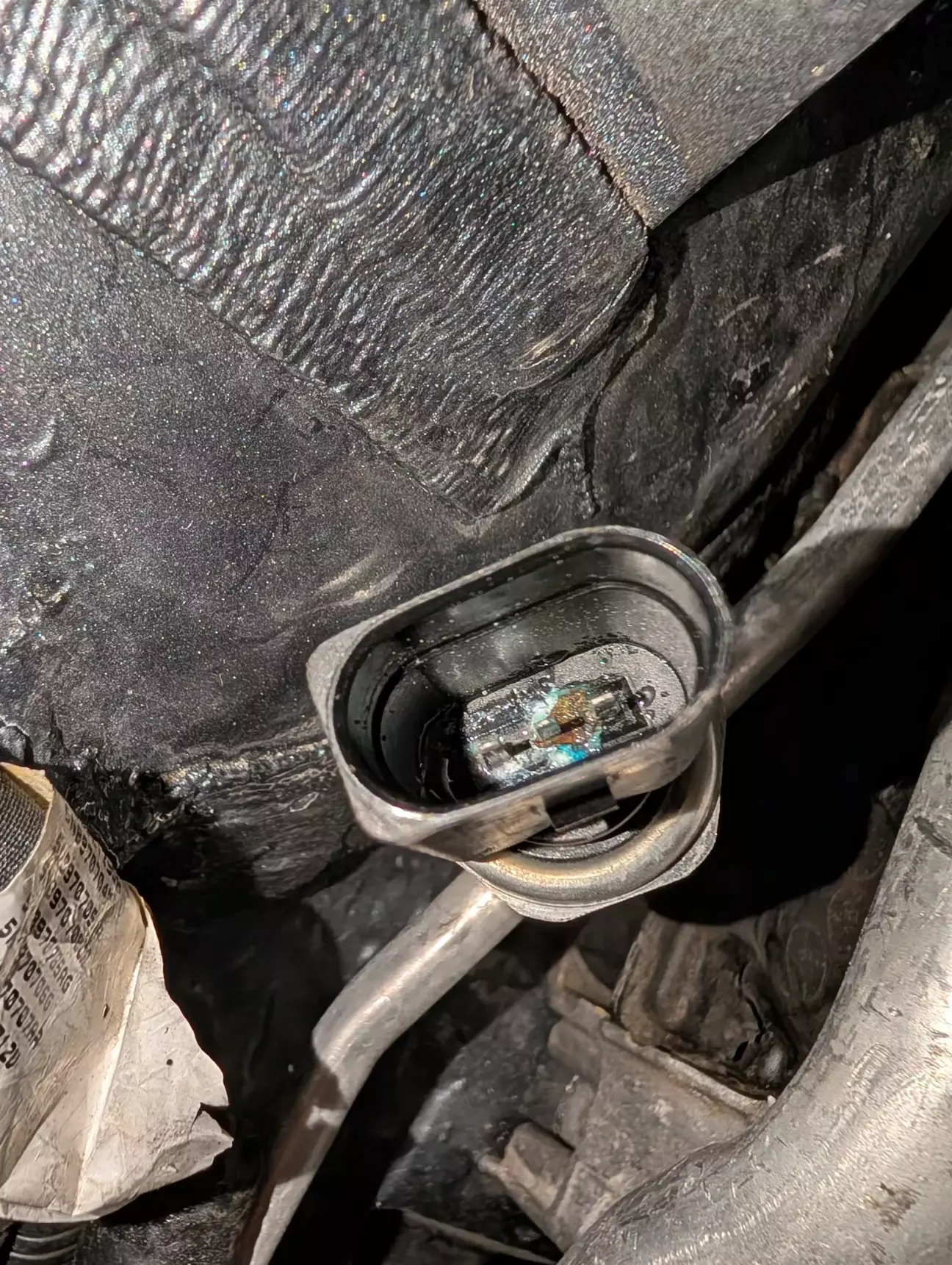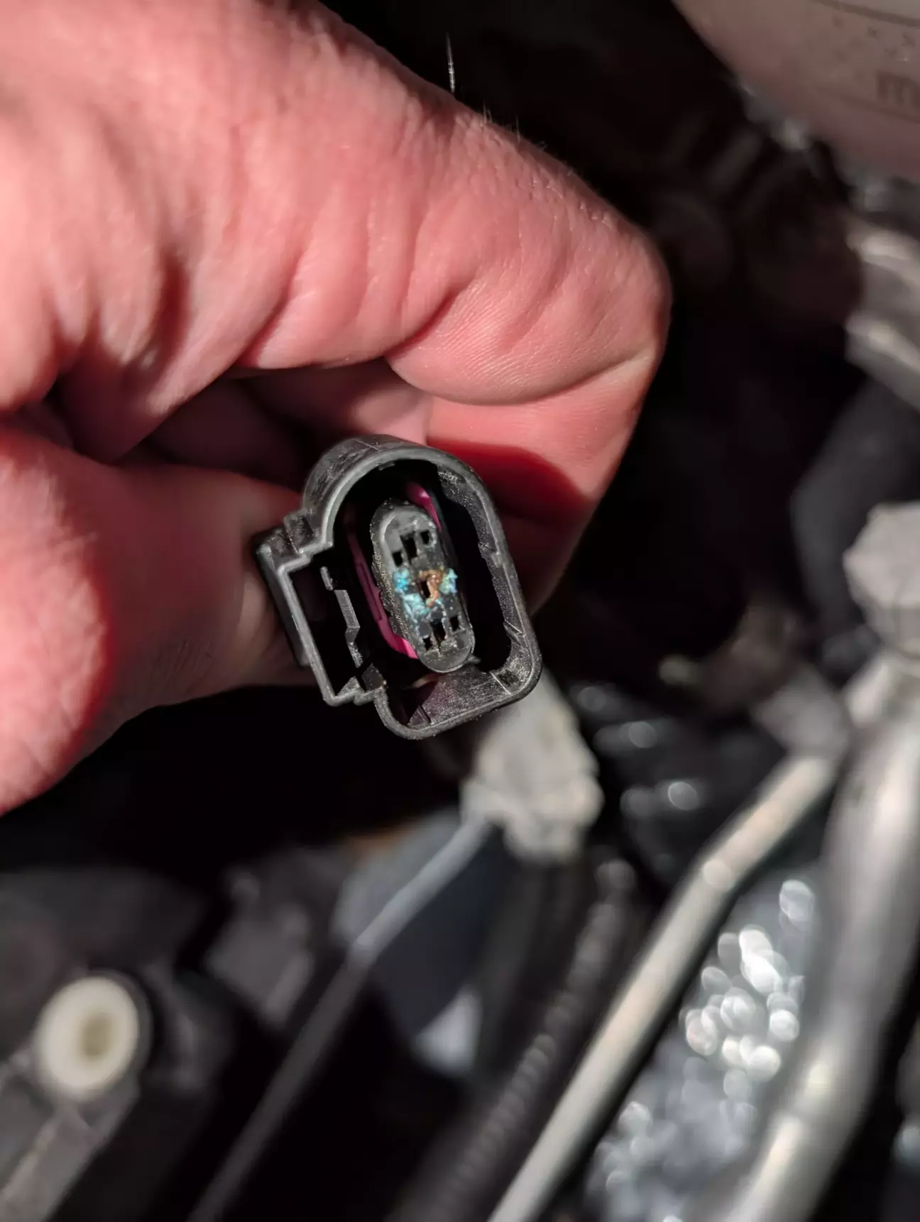 Коли дійшов до датчика тиску компресора і від’єднав його — вентилятор миттєво зупинився! Зовнішній вигляд датчика та фішки (фото додаю) підтвердив здогадку на 99.9% — там усе окислилося та коротило.