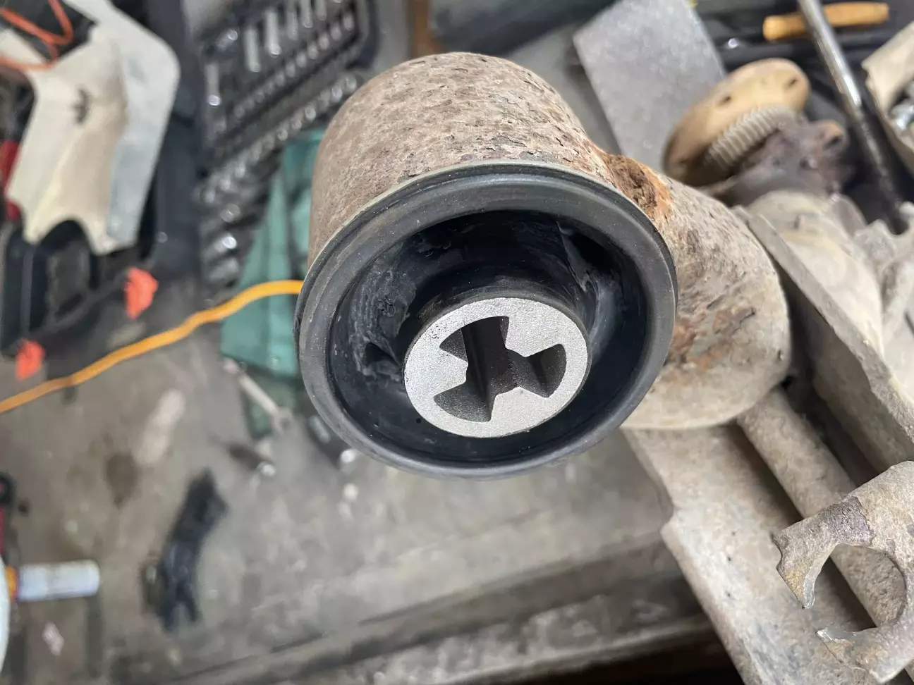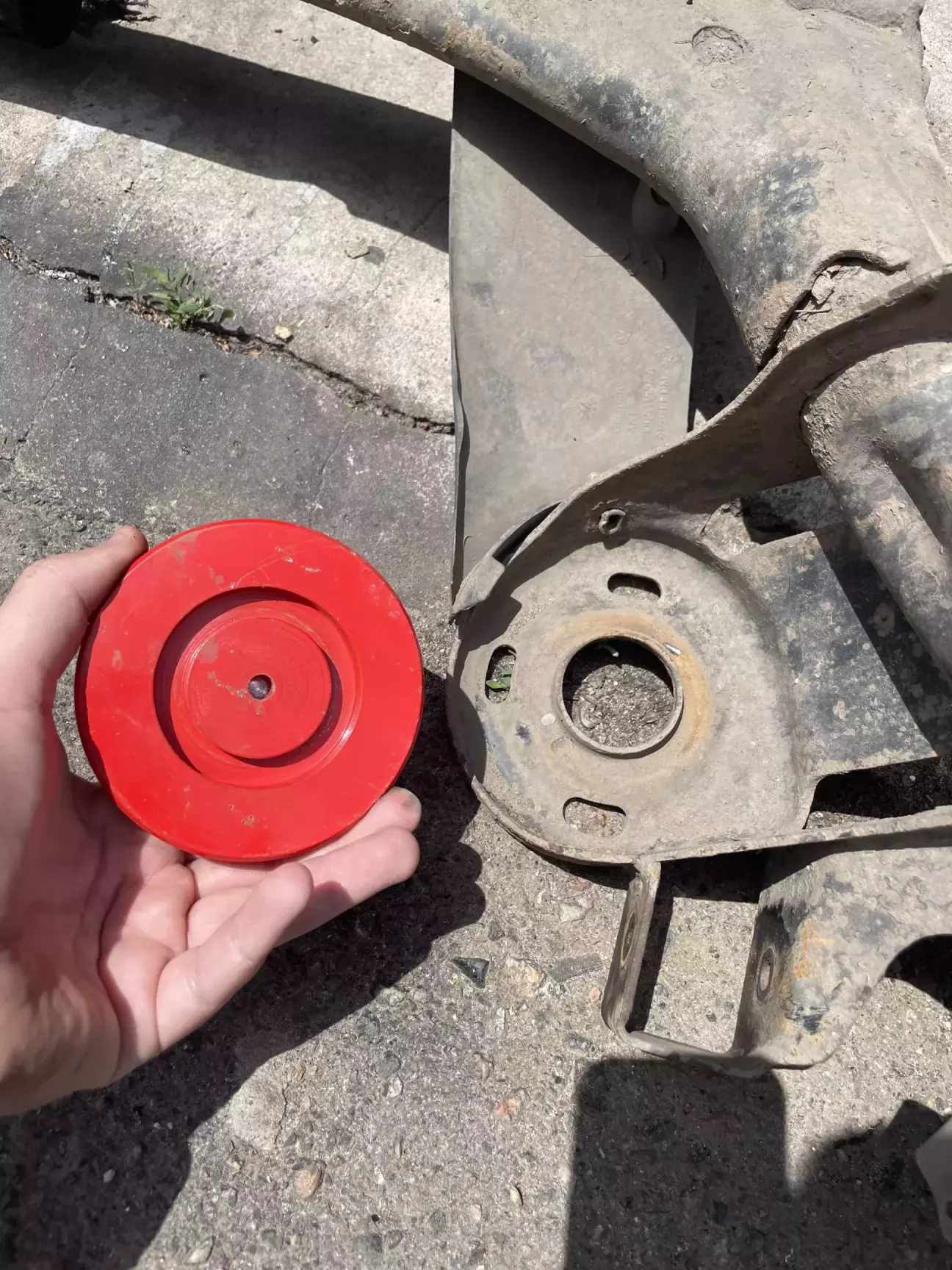 В моєму випадку сайлентблоки балки були демонтовані легко. Враховуючи що сайлент має пластикову обойму, то я просто нагрів газовим пальником посадочне місце, і він випав майже без молоткової активності. Стан сайлентблоку відповідає мему «дарагой днєвнік..». Нові сайленти брав фірми SWAG з новими болтами. Встановлювати їх можна в одному положенні, для цього є мітка на сайленті, яка має співпадати з нижнім зварочним швом на балці.