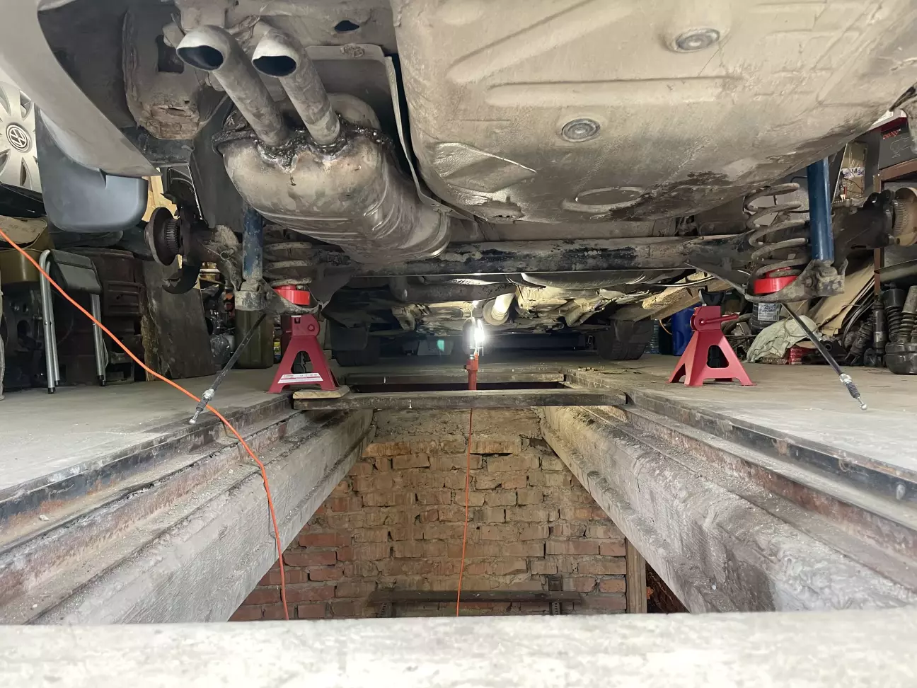 Проблема номер 3. Вихлопна труба з глушником, через відгнивше кріплення була підвʼязана до пружини🤯🤦♂️. Це взагалі піздєц. Я хз який абориген до такого додумався. Але глушник підварив, кріплення також, і повісив його назад на штатне місце.