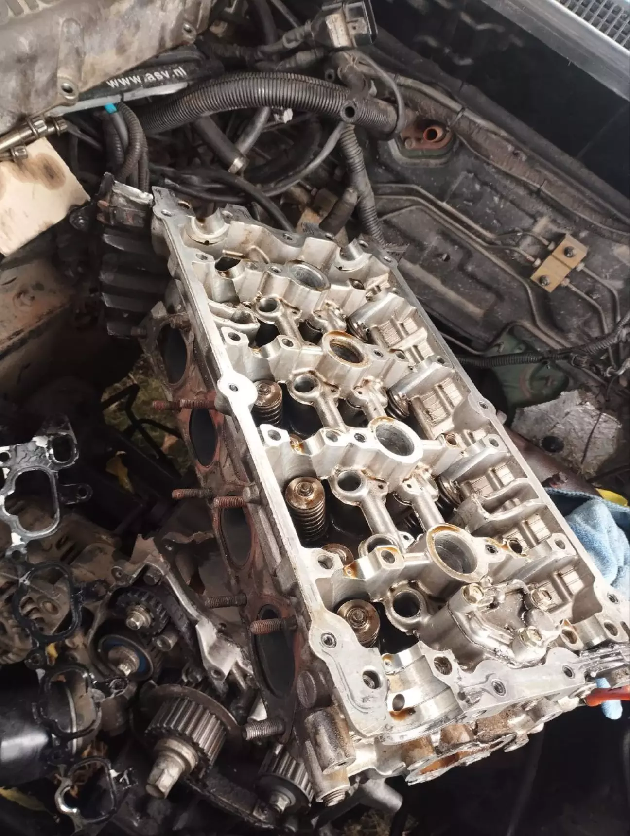 Отже, скинув голову і вердикт - голова на фрезеровку. Причин декілька, по перше - на голові сильна зам'ятина на першому циліндрі від прокладки, таке враження шо голову пережали. По друге - видно де було п'ятно контакту і де продавило. Також було вирішено викинути балансувальні вали. Так, буде трохи вібрація, але мотор крутити буде не так страшно. Разом знайшов місце де сцявся передній сальник колінвалу.