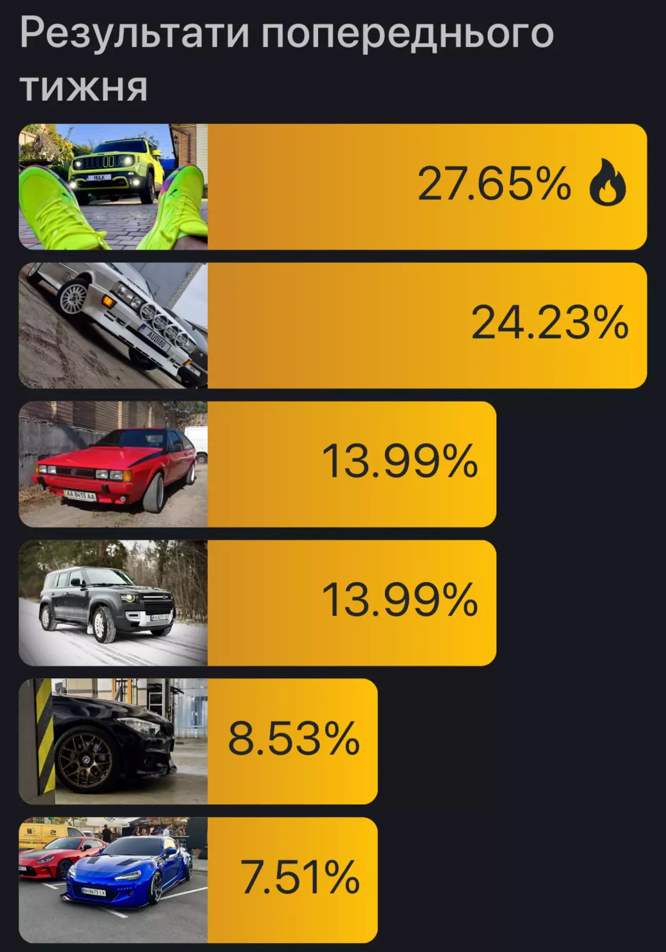 Всім доброго зимового ранку. Пройшов останній тиждень 2025 року і закінчились змагання за вибір авто тижня. Хочу всім подякувати за вашу підтримку і голос. Хочу побажати в наступному році всім миру і Божого благословіння! Щоб у нас зʼявилось більше часу для своїх родин і своїх залізних друзів. Бережіть себе! Слава Україні!