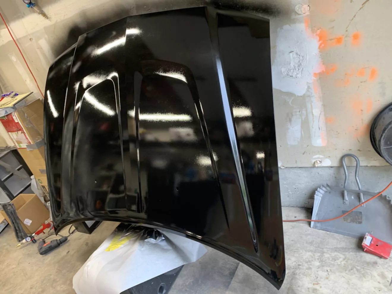 Сегодня наконец-то добрался до своего капота и покрасил. Добавил в чёрную краску немного перламутра оставшегося после покраски бампера. Получилось просто шикарно. Позже отполирую, скину фотки в цвете. А сейчас так.