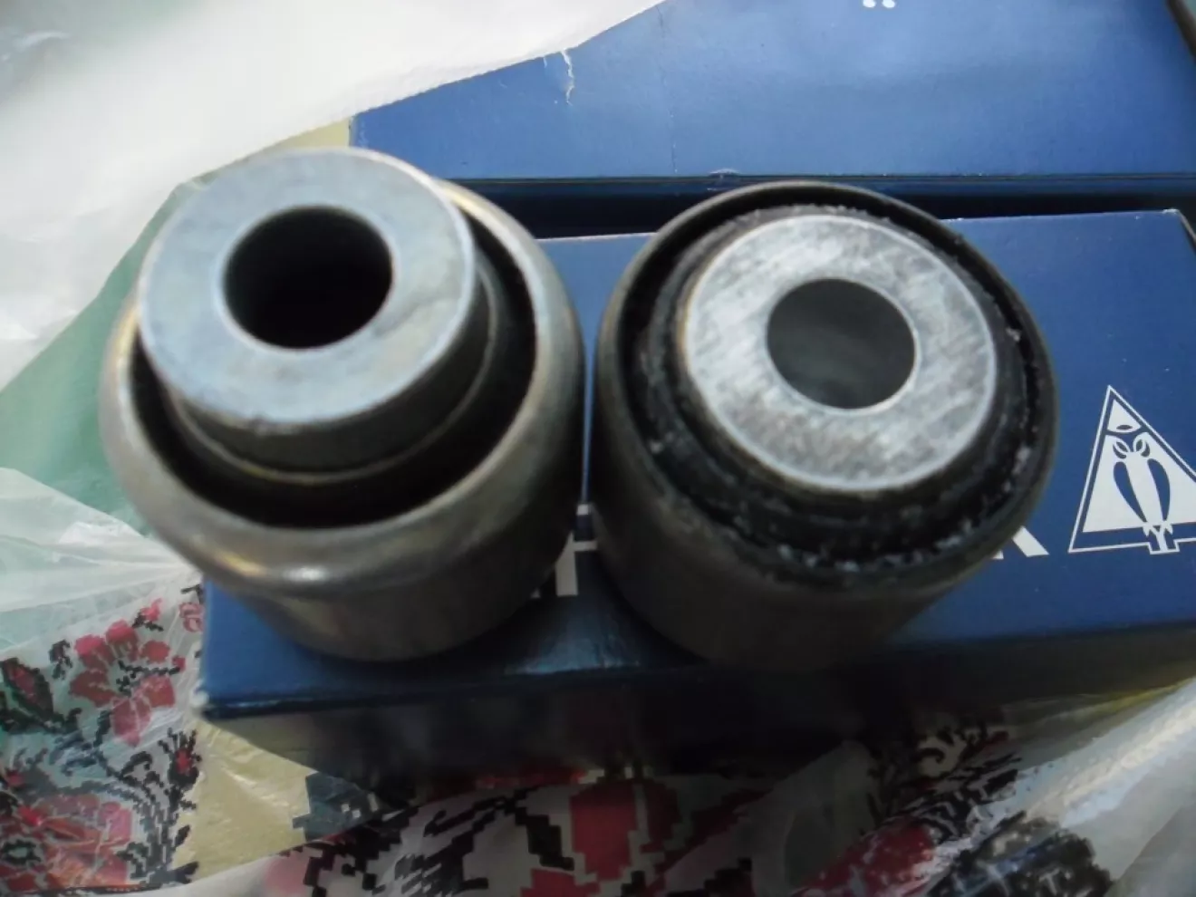 Когда менял подушки подрамника специалист сказал, что отходили еще две тяги стабилизатора и с правой стороны поперечная рулевая тяга и две пружины обломались по ветку.С ездил купил две тяги стабилизатора производитель Lemferder и два сайлент-блока на поперечную рулевую тягу, на пружины денег нет на данный момент, а и самое интересное что смотрел по Етке сайлент-блоки на этот рычаг не бьется, а я купил их на базаре производитель boge выбиты заводские номера, выбито производство германия и где был знак ауди, кольца были срезаны .Отдал я запчасти специалисту, вечером он позвонил машина готова.Приехал забрал машину и думаю посмотрю на старые сайлент-блоки и на тяги развала чтобы сравнить с заводскими те что стояли, потому что рычаг был сто процентов заводской я не разу не менял и тяги тоже.Сравнил эти сайлент-блоки один в один в чем разница была только, что от производителя были срезаны знак ауди, а на заводских нет, тоже самое и стягами стабилизатора. Номер рычага 8e0501529k в котором менялись сайлент-блоки и вот номера сайлент-блоков 8e0501538F и 8e050158M и тяги 8e0505465AF Вот вам и информация для размышления?