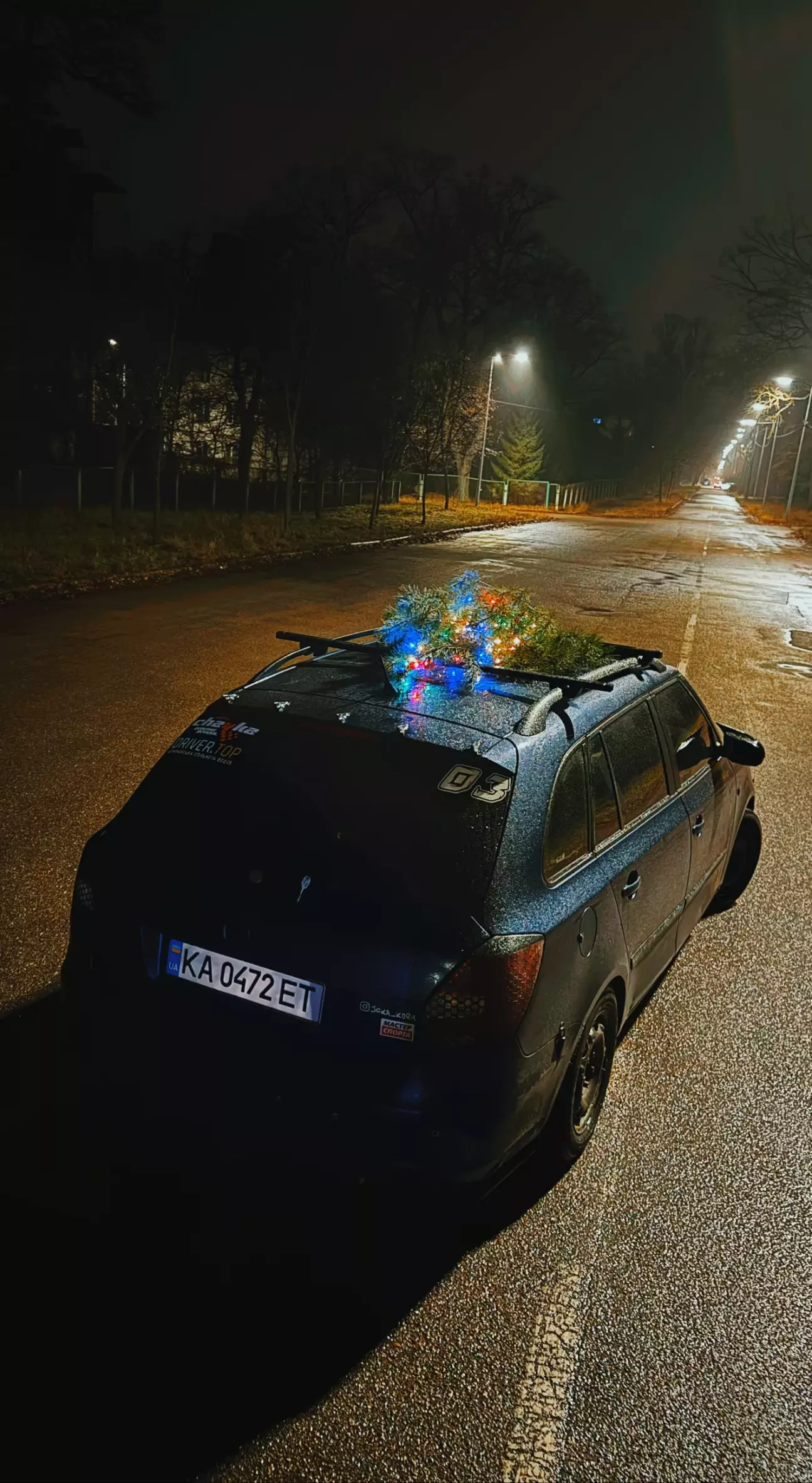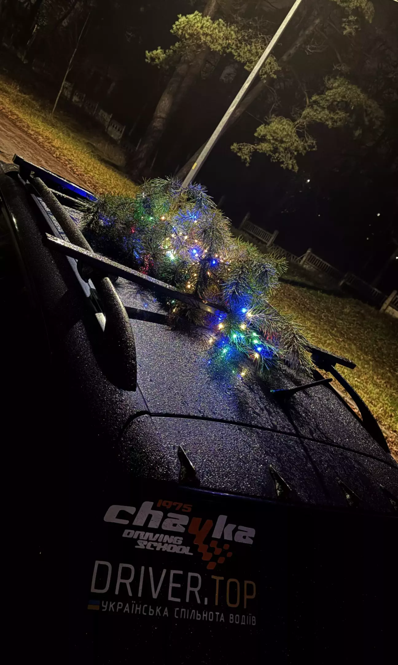 В аврорі придбав пару метрів гірлянди, дві штуки різних кольорів, ну і це все діло на ялинку, далі закріпив до багажника ялинку. Вже перевірено на швидкість 160 км 😄