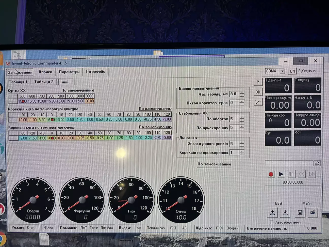 - запускаємо прогрітий двигун . У командері у вікні «керування запаленням» є показник «регулювання нульового кута», Вмикаем стробоскоп і мінусуем цей показник до поки страбоскоп не покаже позначку «0» на маховику . По суті це все що треба зробити . Далі вимикаем тест та глушим .