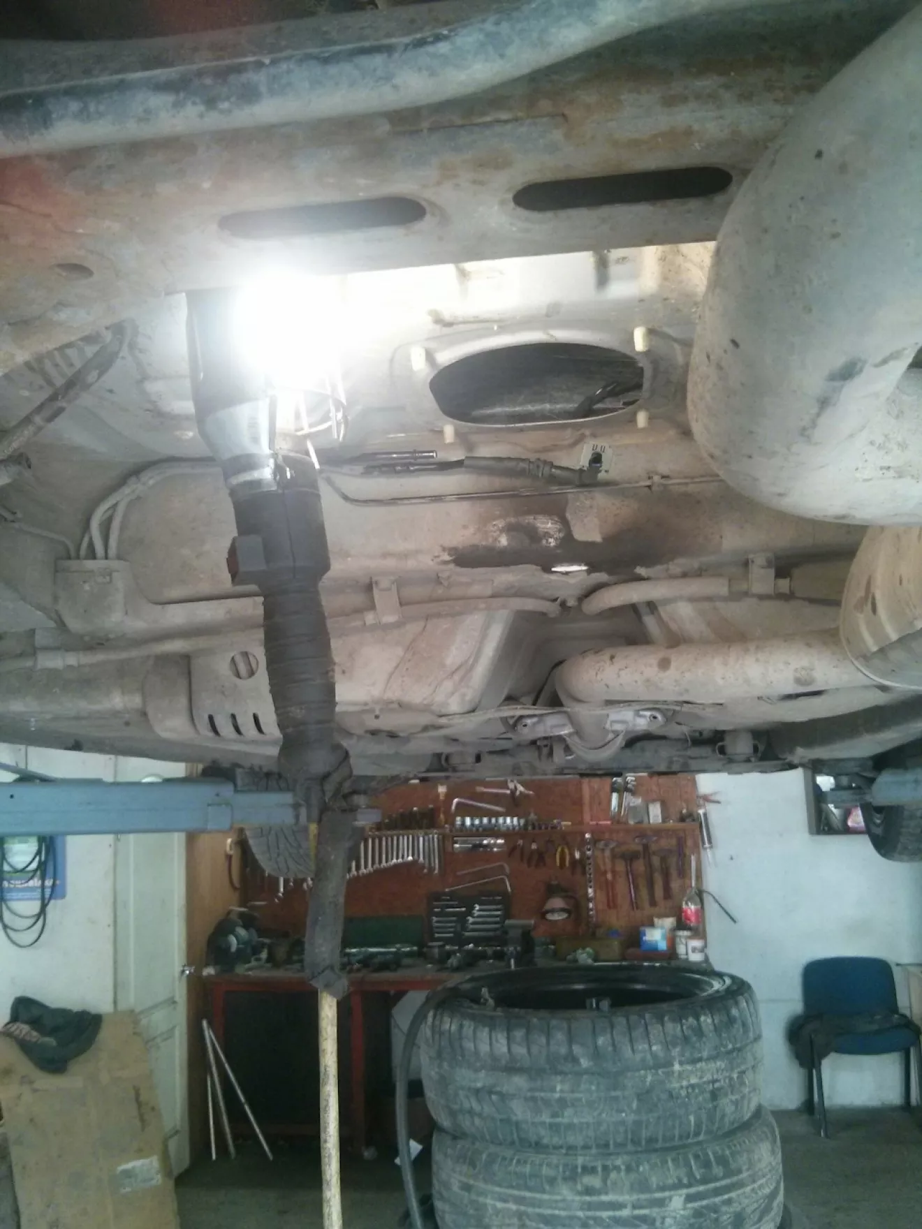 Подняли машину на подъемнике, подставили под бак подставку, открутили его от кузова и начали по чуть-чуть опускать.