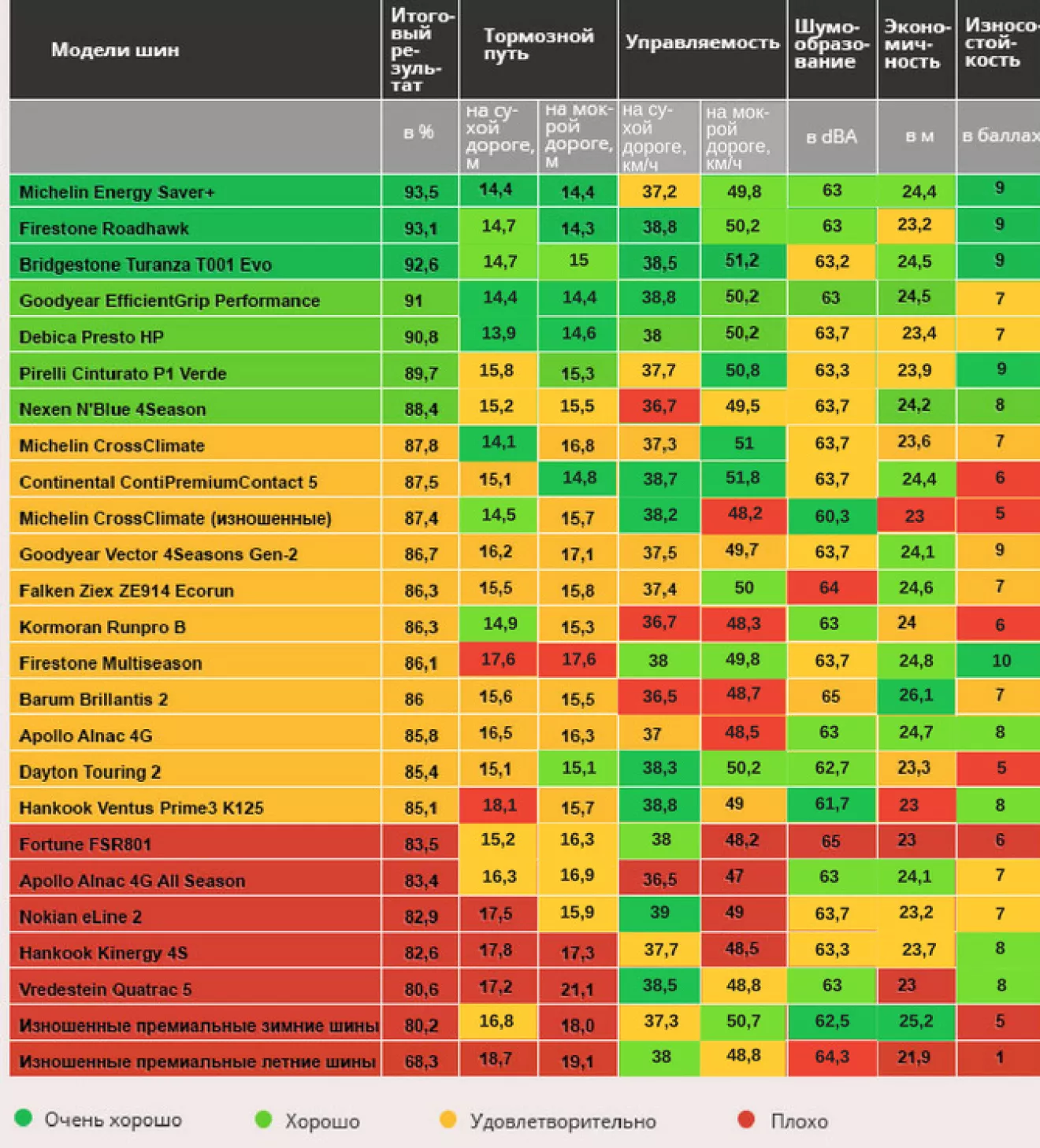 И вот еще добавляю заключительную таблицу со средними показателями отзывов, по шинам которые были здесь предложены, в расчете на размер R15 195/65. Красными большими цифрами добавил стоимость в гривнах, (2600грн.=100$) просто для сравнения, думаю валюта здесь не столь значительна.