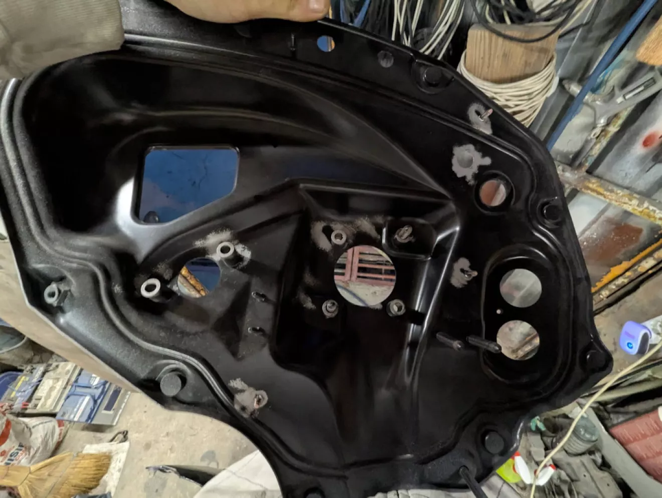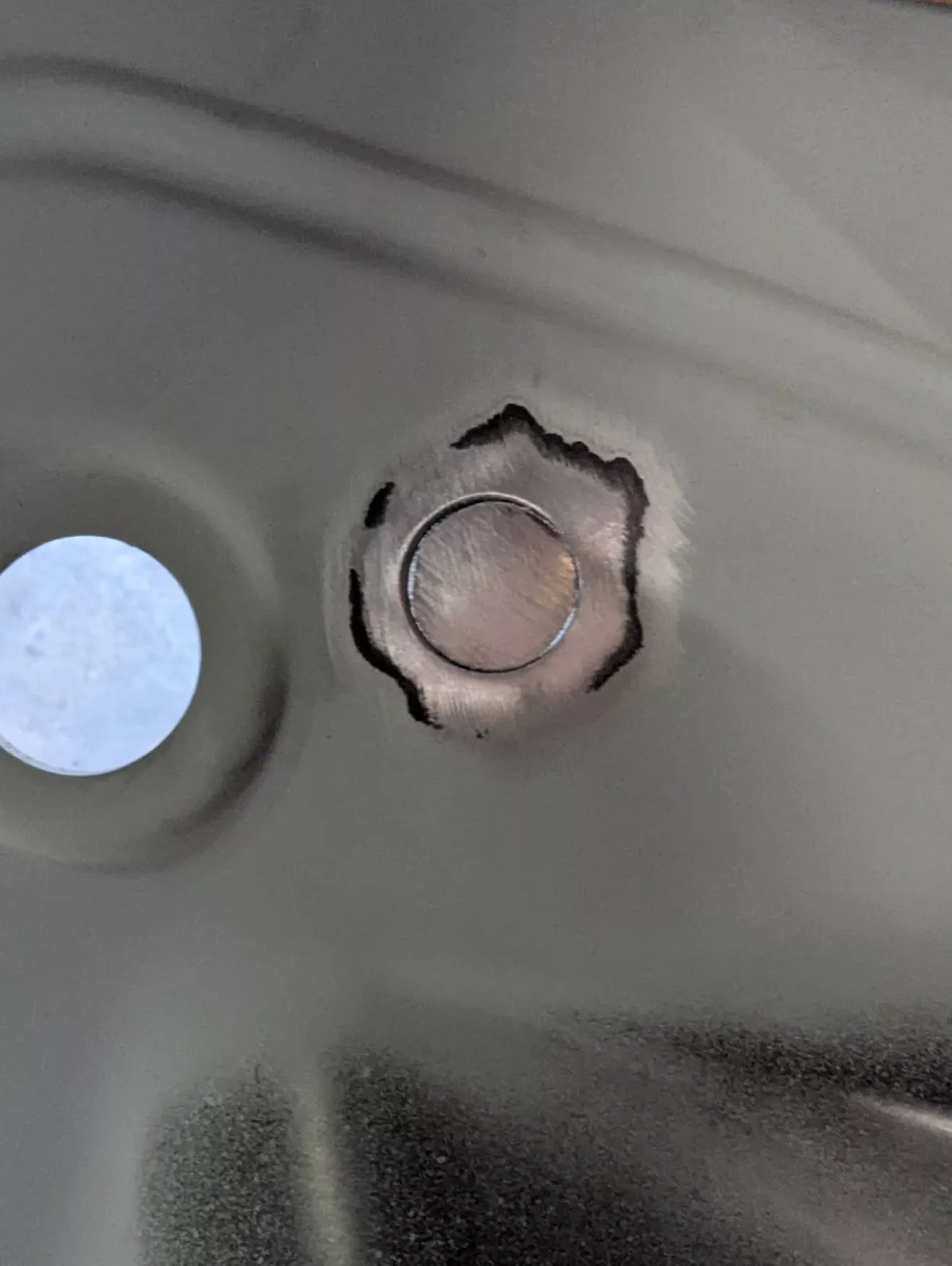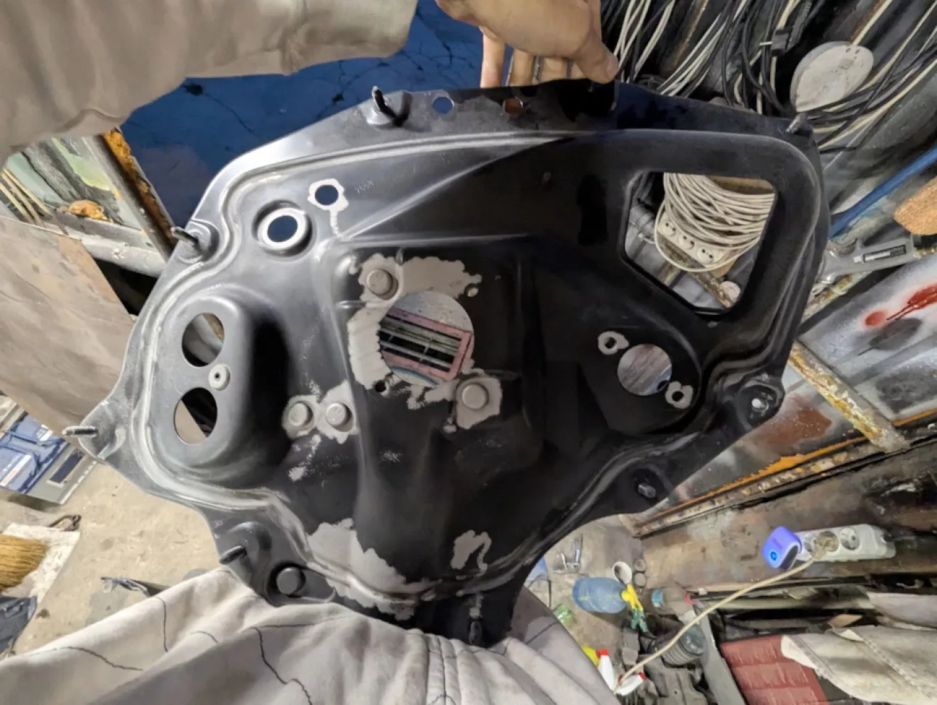 Также какой-то из прежних владельцев решил сделать внушительное отверстие над педалью газа — видимо, хотел протянуть провода в салон и посчитал это самым простым вариантом. Решил устранить «тюнинг»: вырезал кружок из листа металла и заварил дыру.