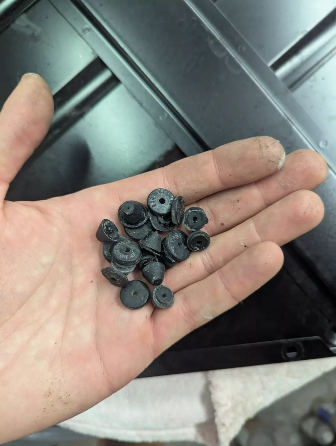 К сожалению, оригинальные резиновые упоры снять без повреждений не удалось. Пробовал разные методы, но, похоже, за годы резина пересохла и стала дубовой. В итоге их аккуратно срезал и заказал новые — оригинал уже не найти, поэтому взял аналоги с «Тему».